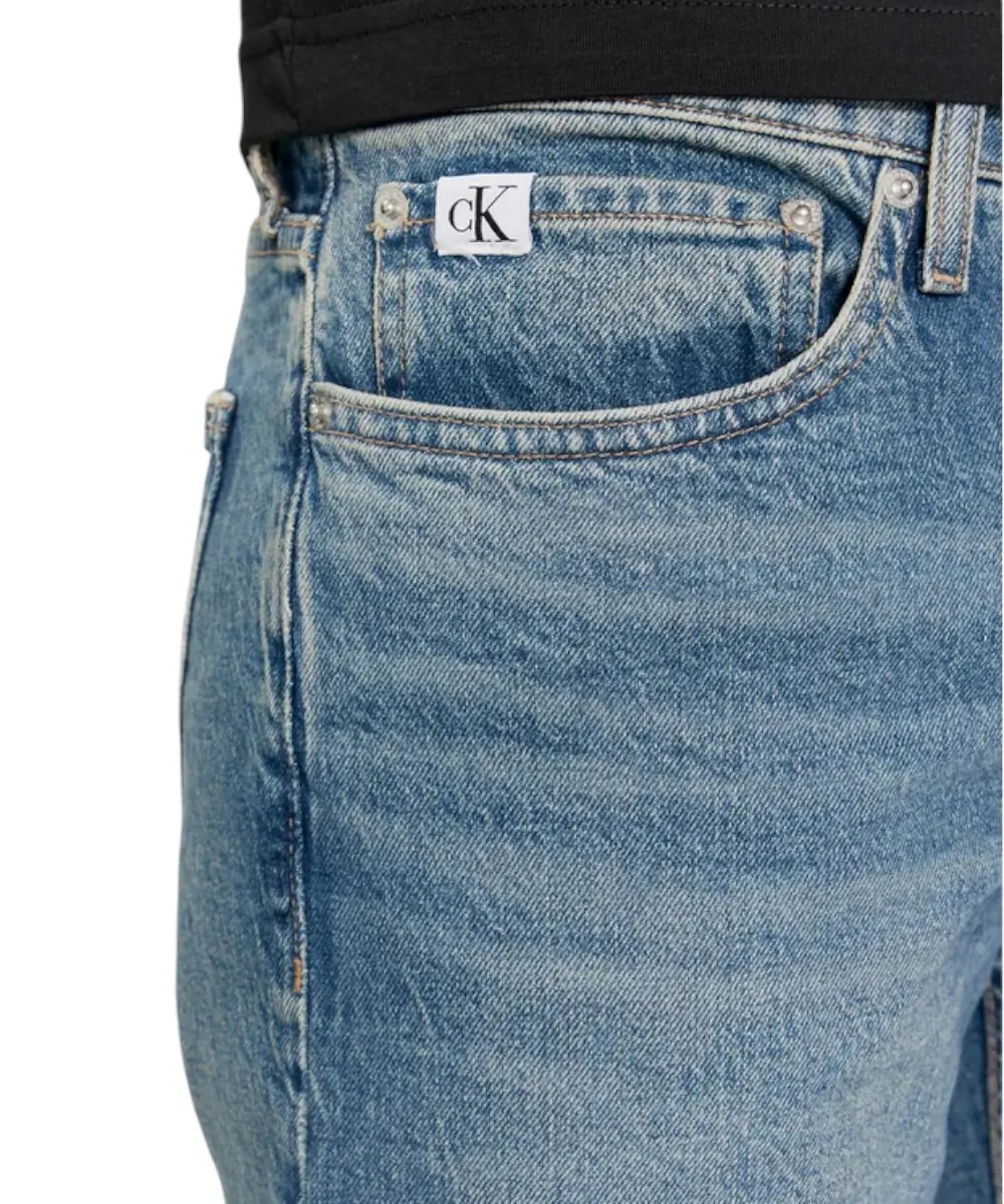 Το ύφασμα διαθέτει ελαφρύ ξεβαμμένο (slavato) εφέ που προσθέτει casual χαρακτήρα, ενώ η μικρή προσθήκη ελαστάνης προσφέρει ελευθερία κινήσεων και άνετη εφαρμογή καθ’ όλη τη διάρκεια της ημέρας. Ο κλασικός σχεδιασμός με πέντε τσέπες, κλείσιμο με κουμπί και φερμουάρ και το διακριτικό λογότυπο Calvin Klein ολοκληρώνουν το στυλ.