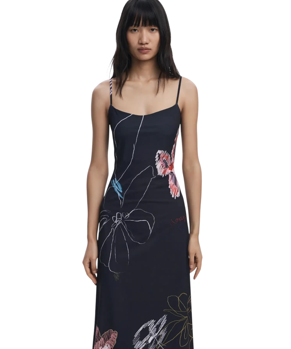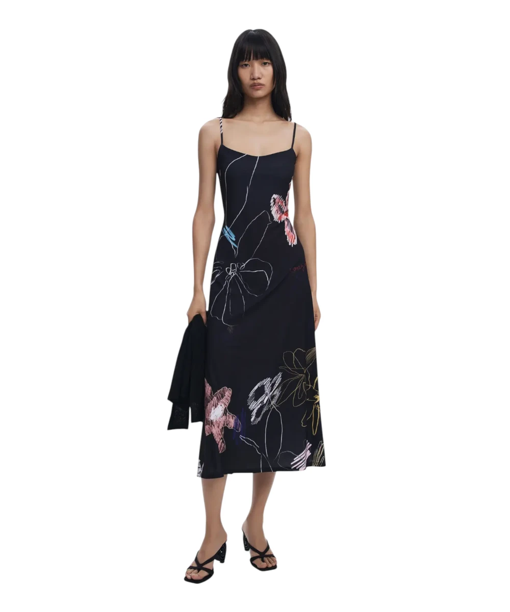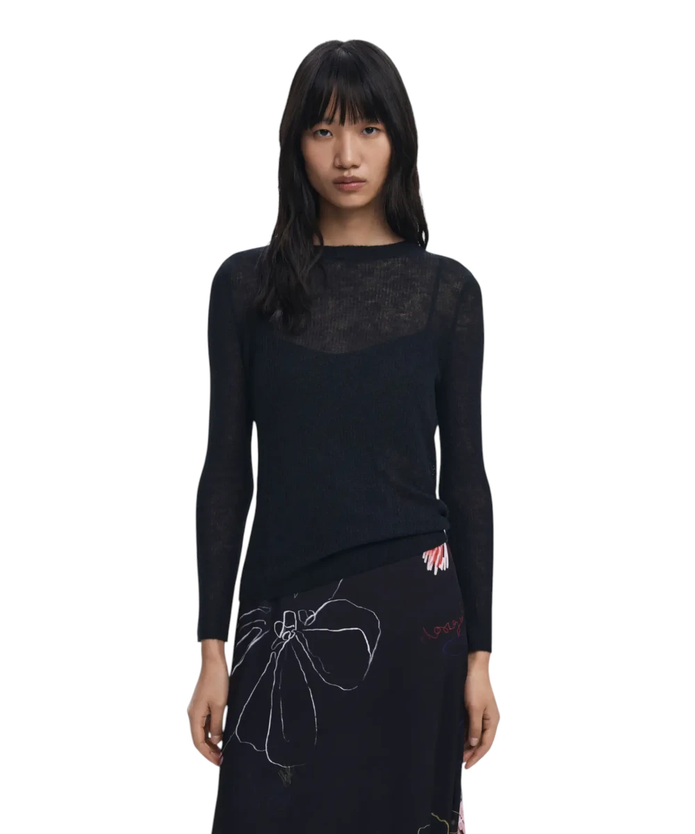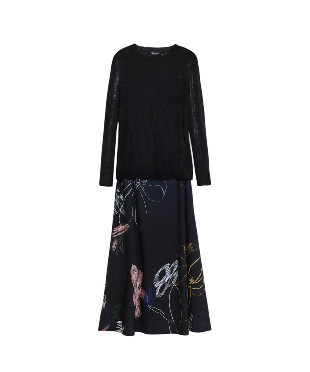 Φόρεμα από τη συλλογή Desigual κατασκευασμένο από λεπτό, ελαστικό πλεκτό. Το μοντέλο συνοδεύεται από ένα πουλόβερ.