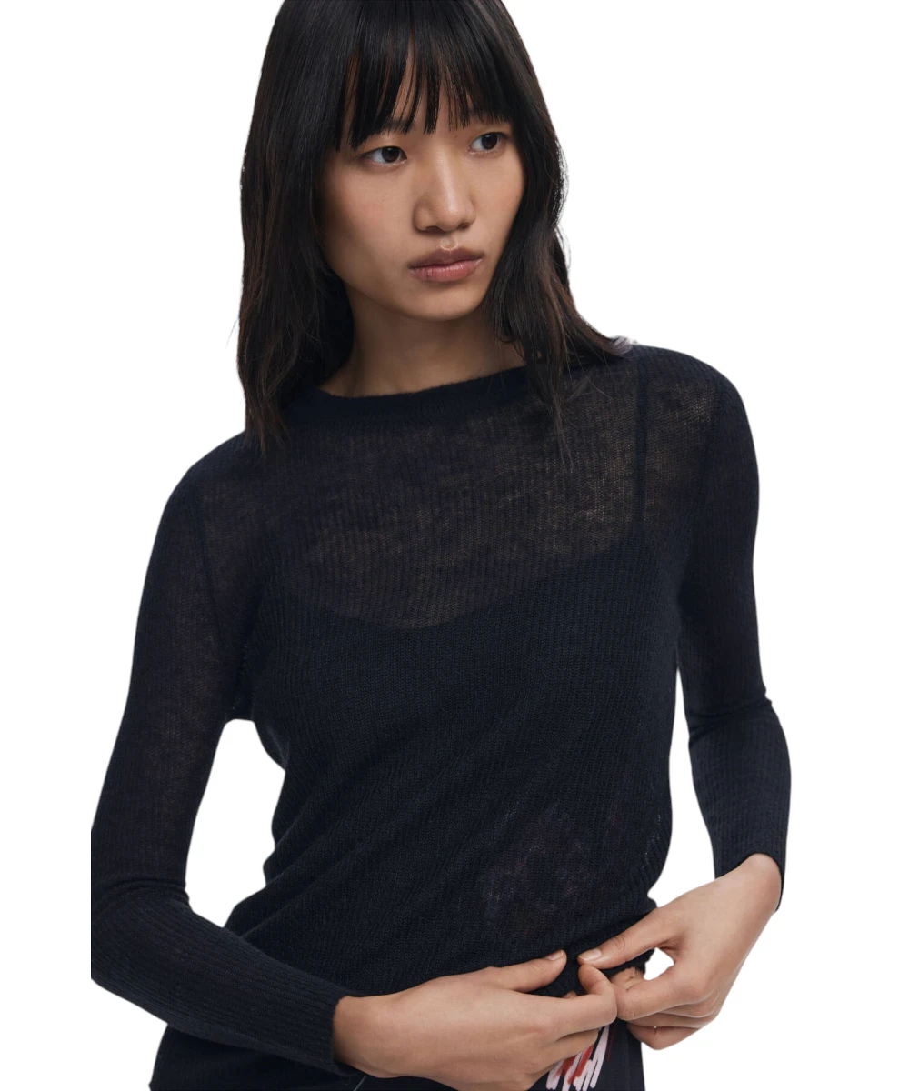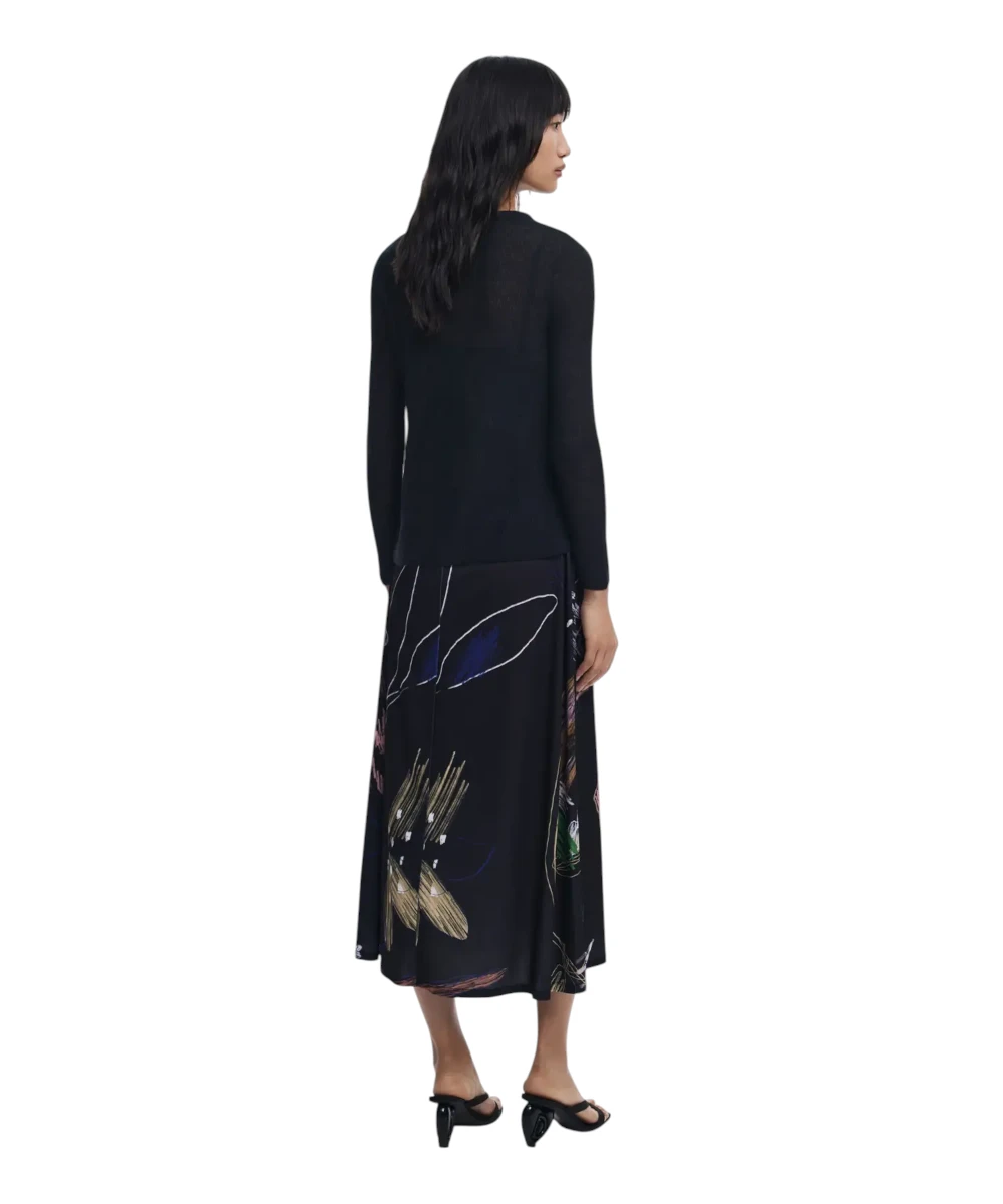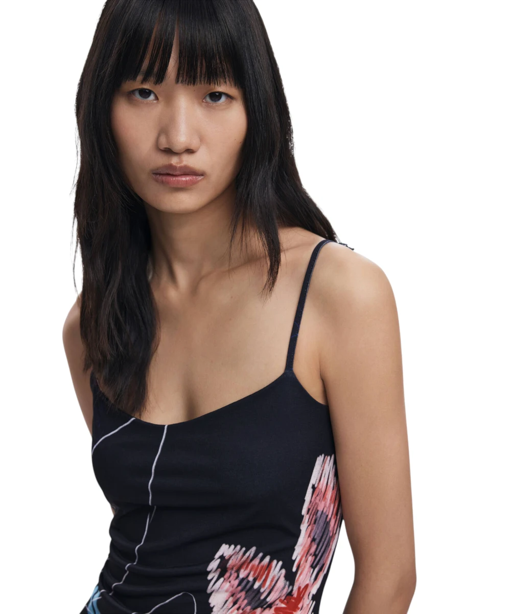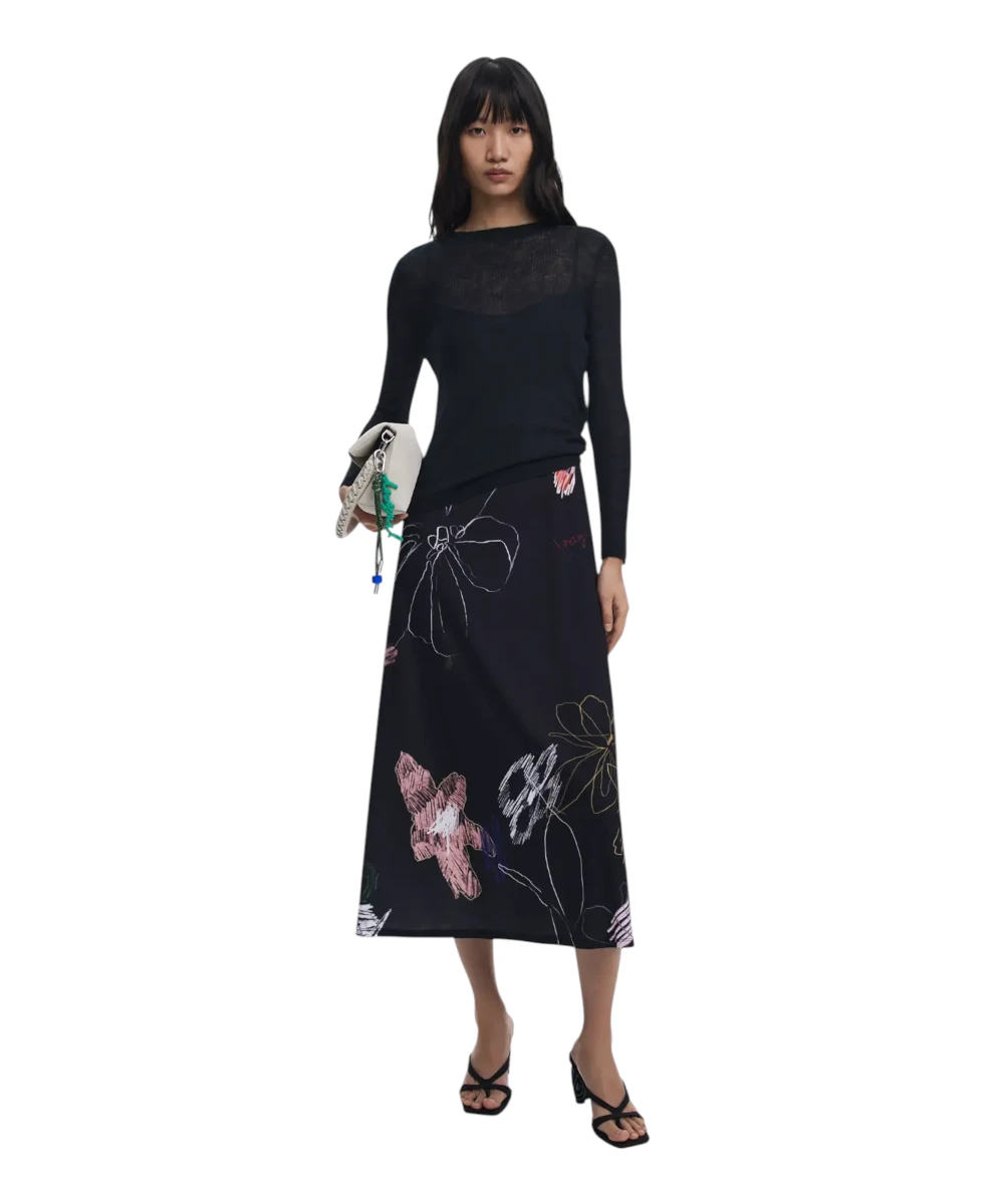 Φόρεμα από τη συλλογή Desigual κατασκευασμένο από λεπτό, ελαστικό πλεκτό. Το μοντέλο συνοδεύεται από ένα πουλόβερ.