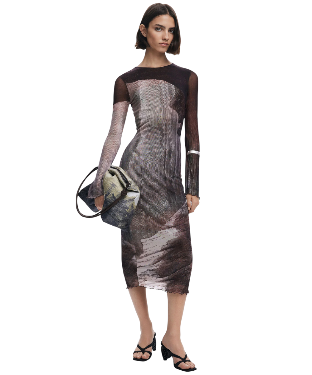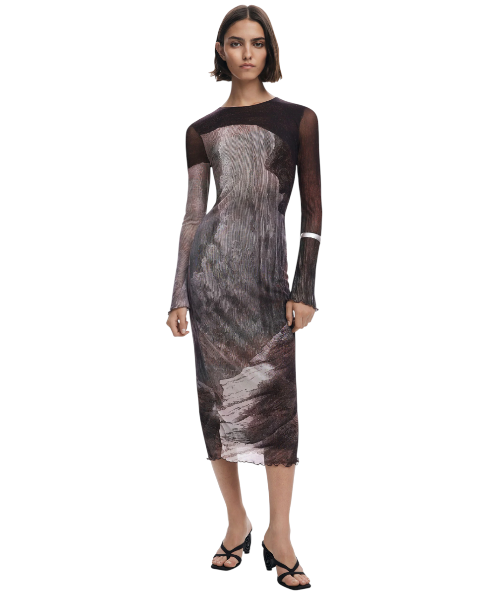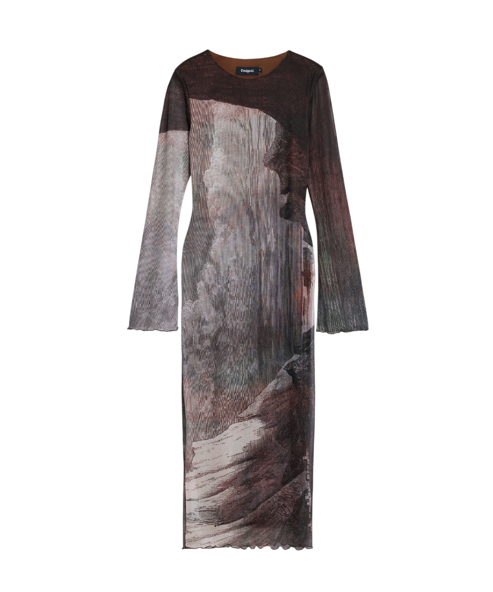 Μίντι φόρεμα της Desigual, με μακρύ καμπάνα μανίκι, στρογγυλή λαιμόκοψη, τελειώματα σε ριπ και σχέδιο τοπίου σχεδιασμένο από τον Monsieur Christian Lacroix.