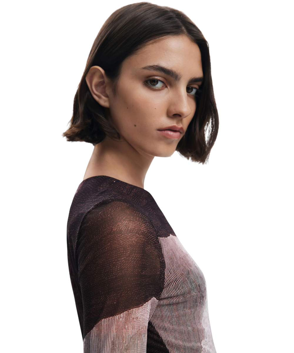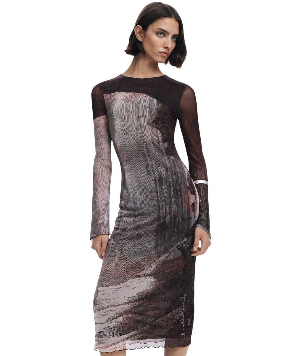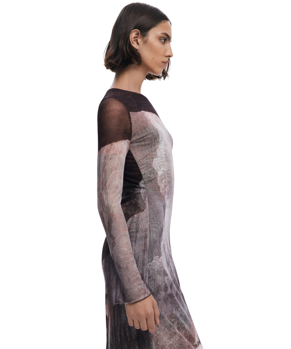 Μίντι φόρεμα της Desigual, με μακρύ καμπάνα μανίκι, στρογγυλή λαιμόκοψη, τελειώματα σε ριπ και σχέδιο τοπίου σχεδιασμένο από τον Monsieur Christian Lacroix.
