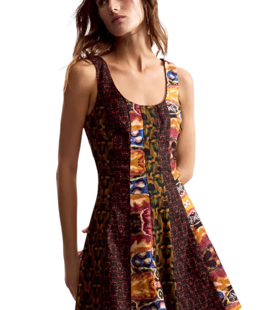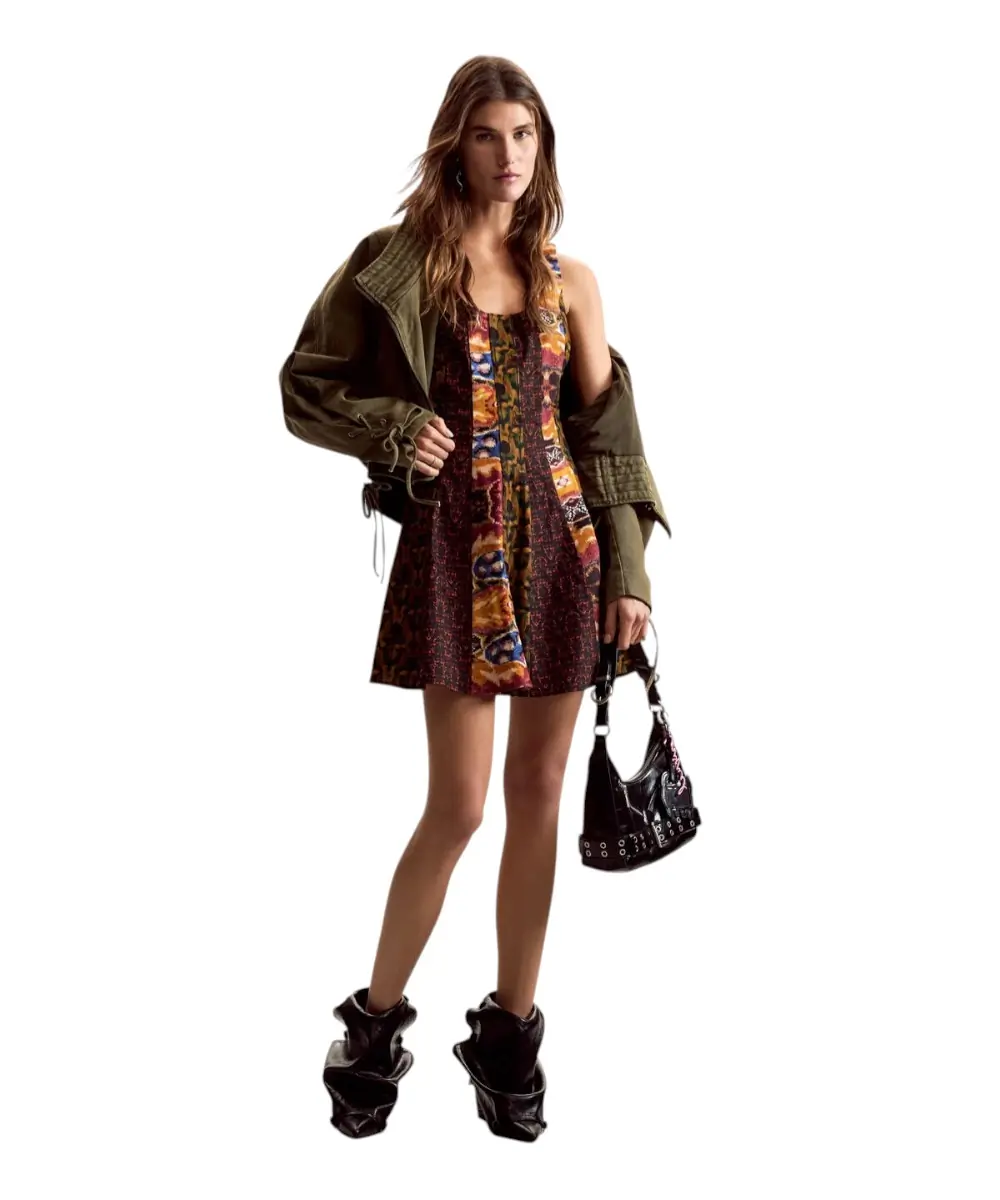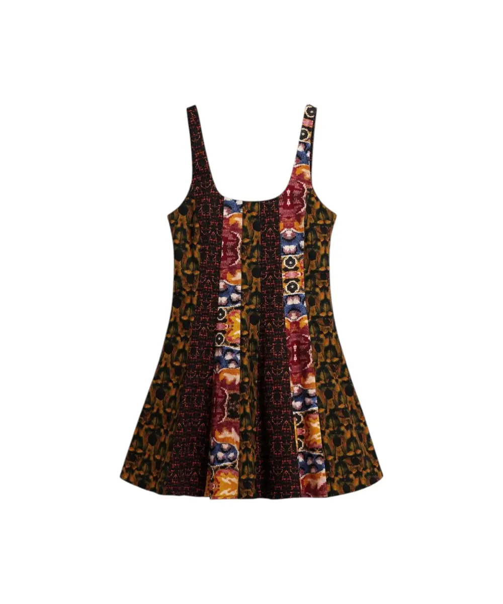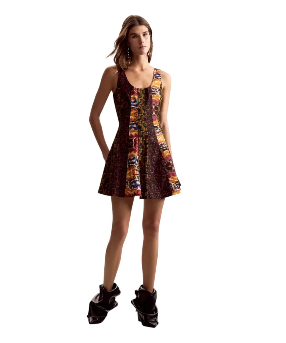 • Styling Tip: Καθώς το patchwork print είναι πολύ πλούσιο, προτιμήστε minimal σκουλαρίκια. Μια midi πλισέ φούστα φορεμένη από μέσα σε κίτρινο ή μαύρο χρώμα μπορεί να μετατρέψει το κοντό φόρεμα σε ένα ενδιαφέρον “double-layer” σύνολο, προσθέτοντας μήκος και κίνηση.