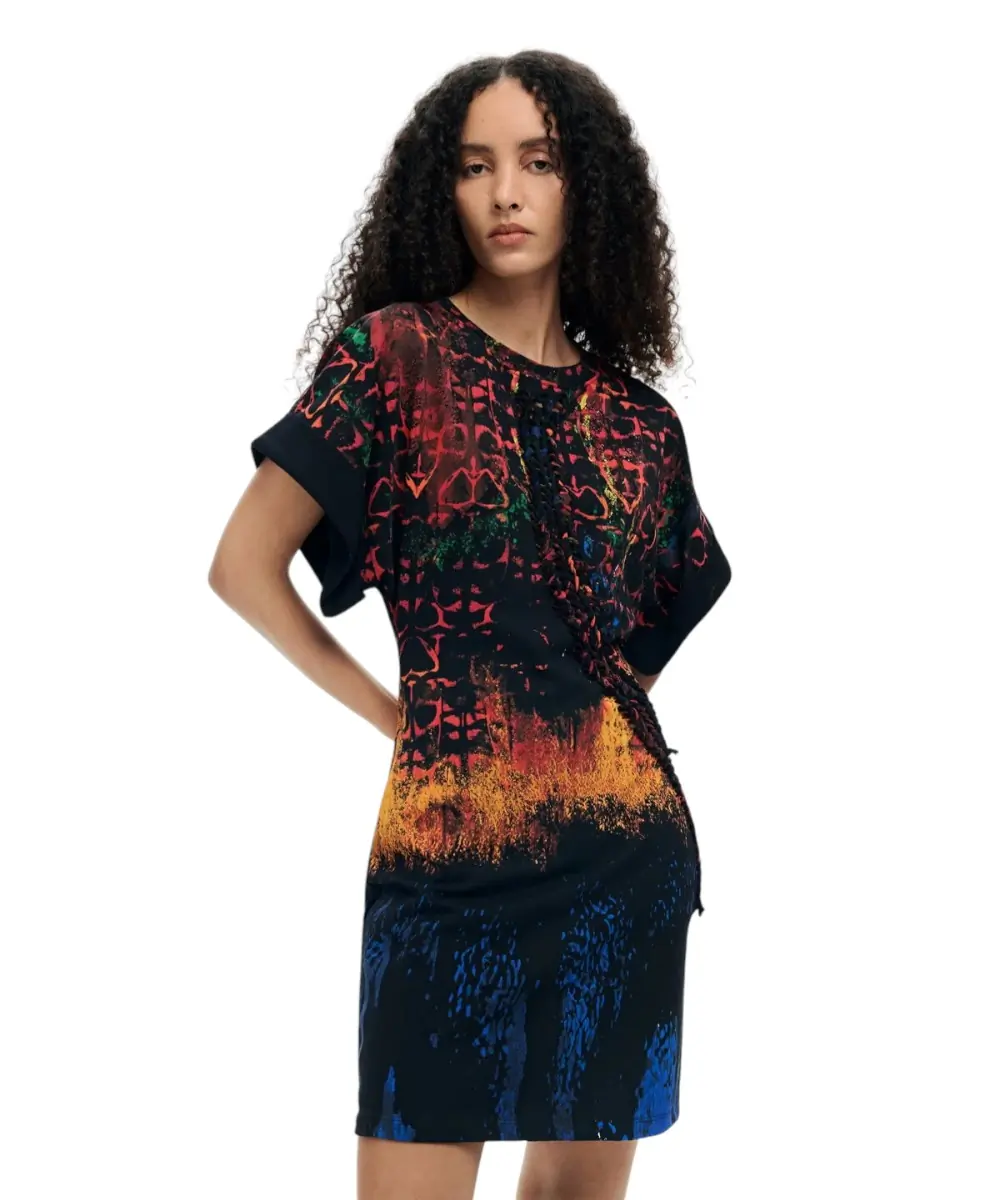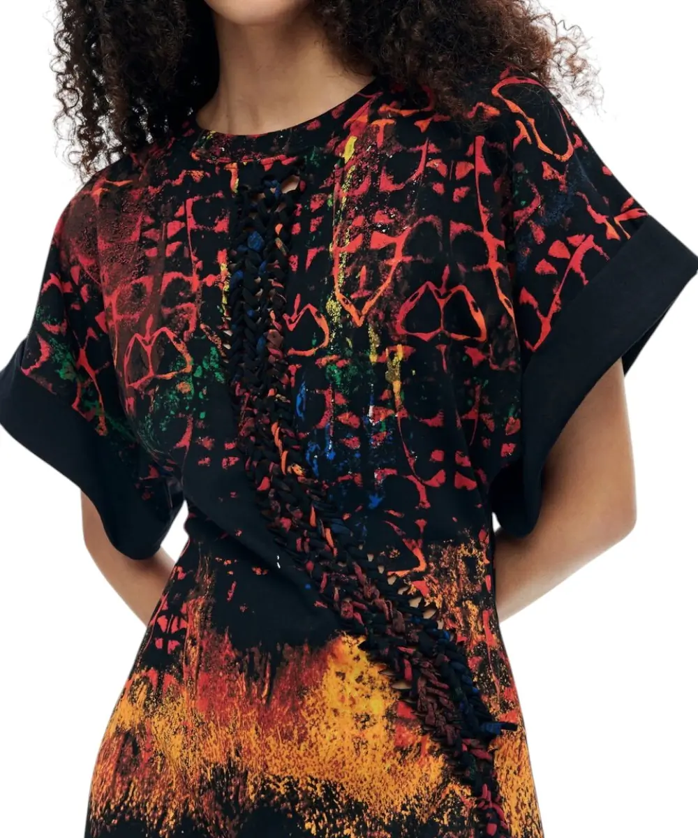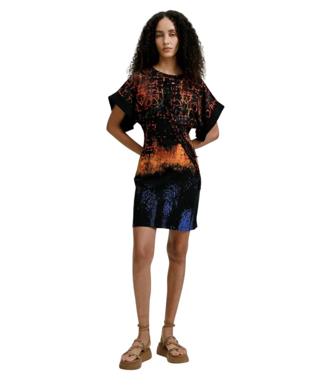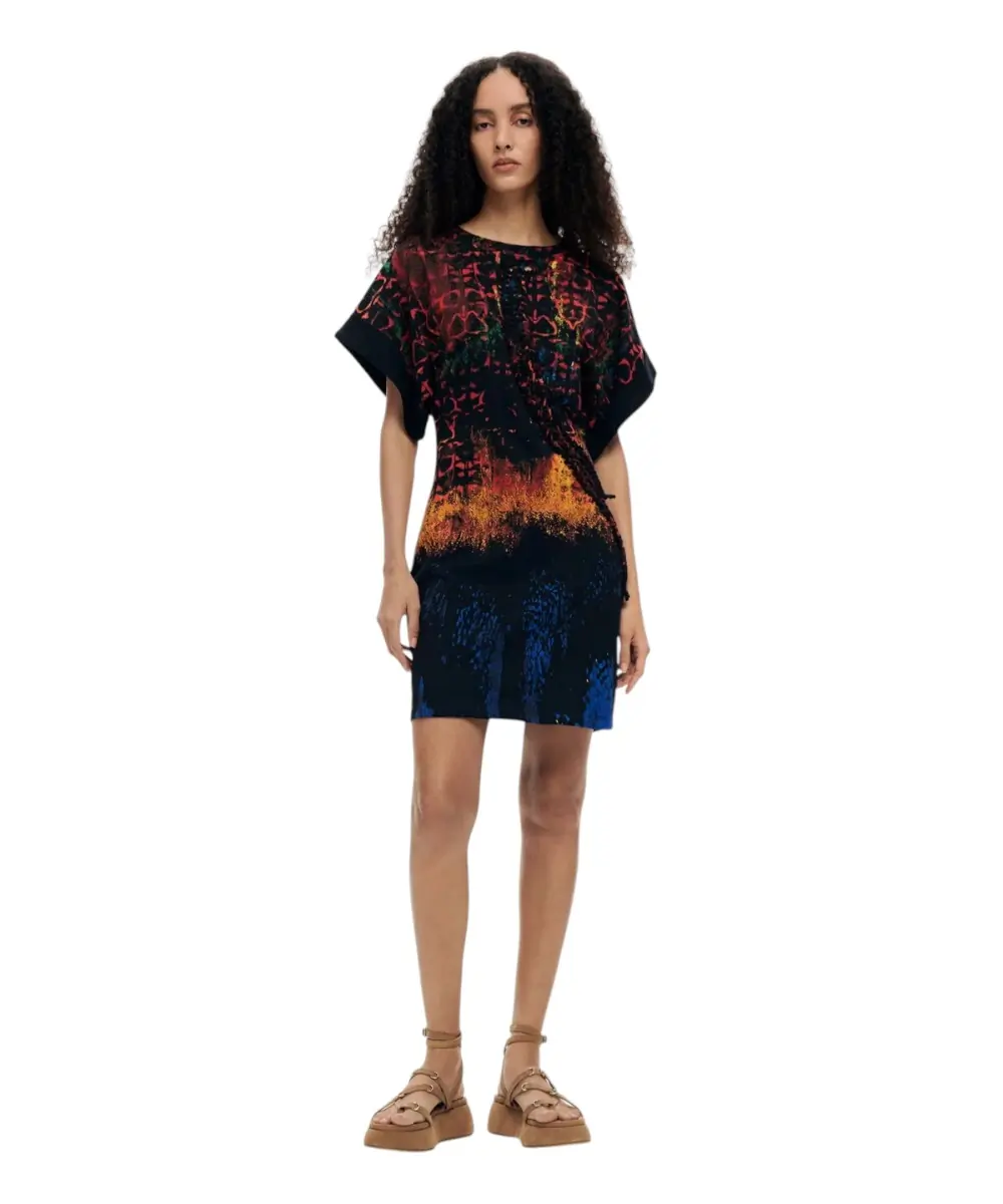 Το φόρεμα Bettle Lacroix από τη συλλογή Άνοιξη/Καλοκαίρι 2026 είναι μια καλλιτεχνική δημιουργία του διάσημου σχεδιαστή Christian Lacroix. Σε μαύρη βάση, αυτό το 100% βαμβακερό κομμάτι συνδυάζει την πολυτέλεια του υψηλού σχεδιασμού με την καθημερινή άνεση, διαθέτοντας ένα εντυπωσιακό και πολύχρωμο μοτίβο που αντανακλά την εκρηκτική αισθητική του δημιουργού του.
