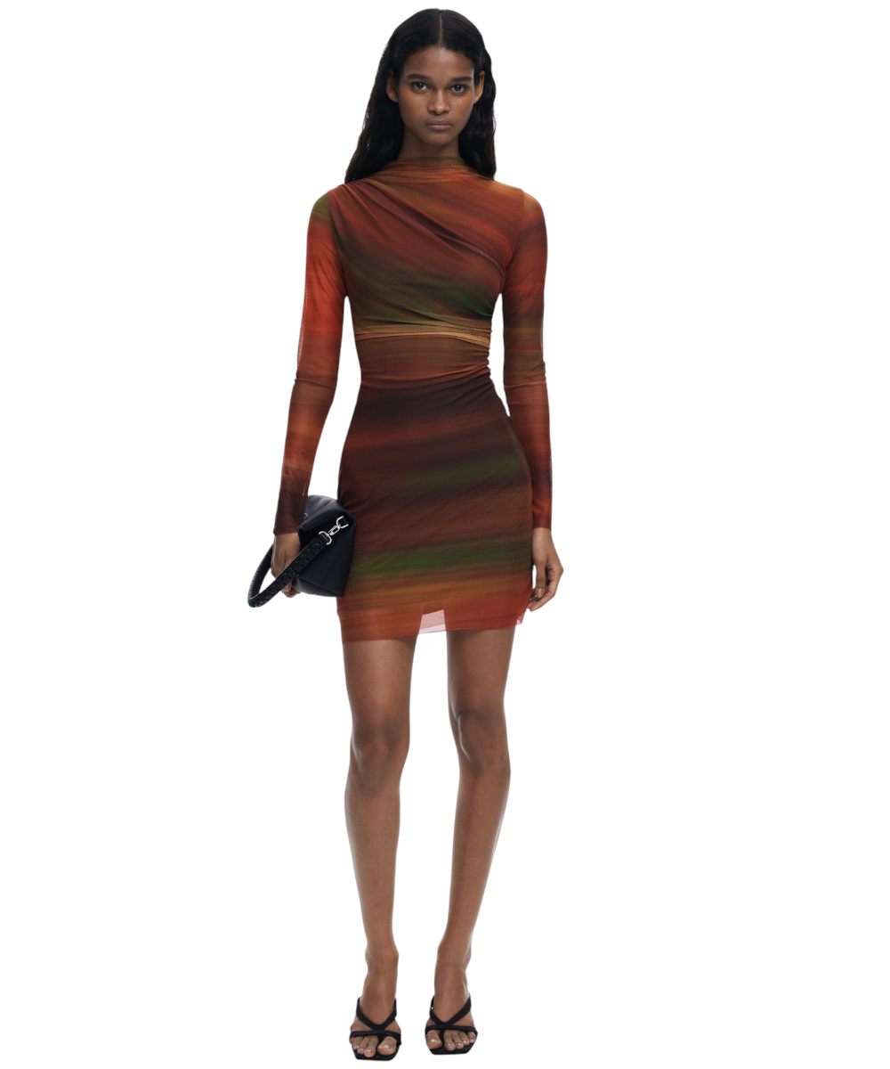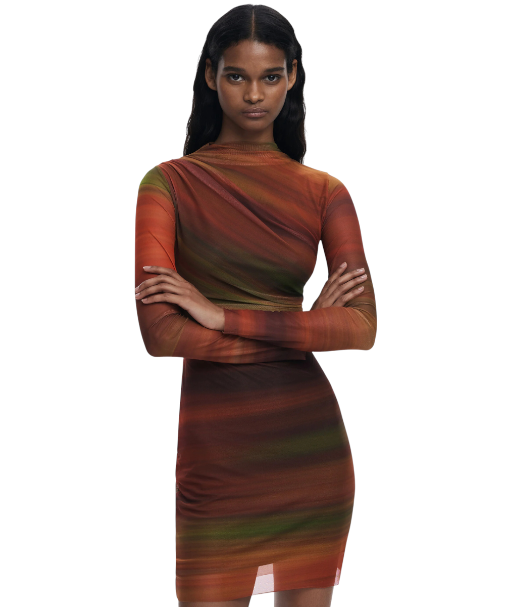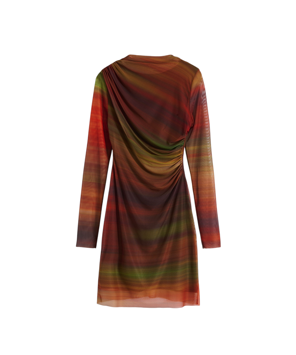 Κοντό φόρεμα της Desigual από τούλι, με μακριά μανίκια, ελαφρώς ψηλό λαιμό, με μπροστινό ντραπέ και σχέδιο με ρίγες σε απαλές αποχρώσεις.