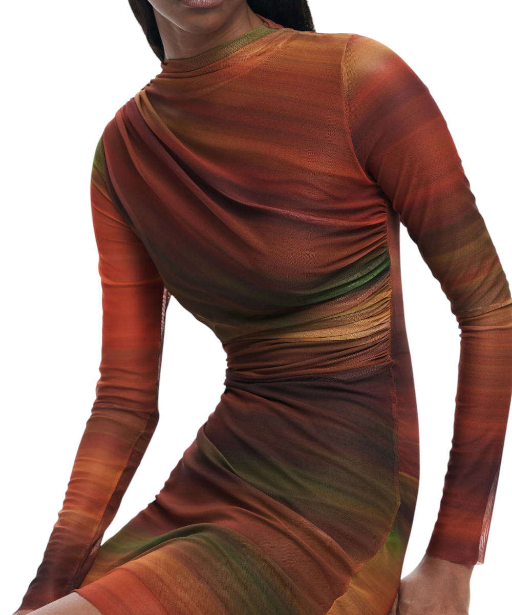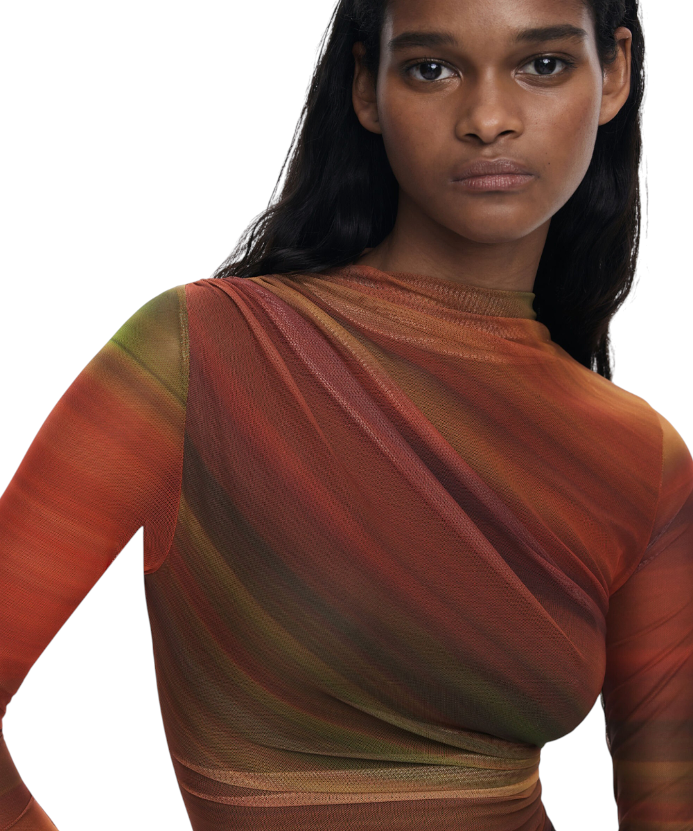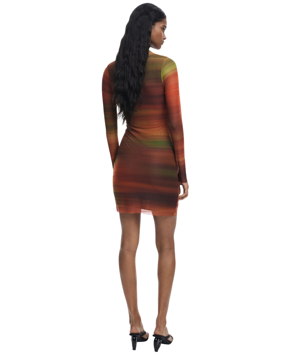 Κοντό φόρεμα της Desigual από τούλι, με μακριά μανίκια, ελαφρώς ψηλό λαιμό, με μπροστινό ντραπέ και σχέδιο με ρίγες σε απαλές αποχρώσεις.