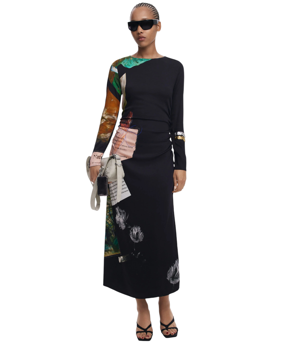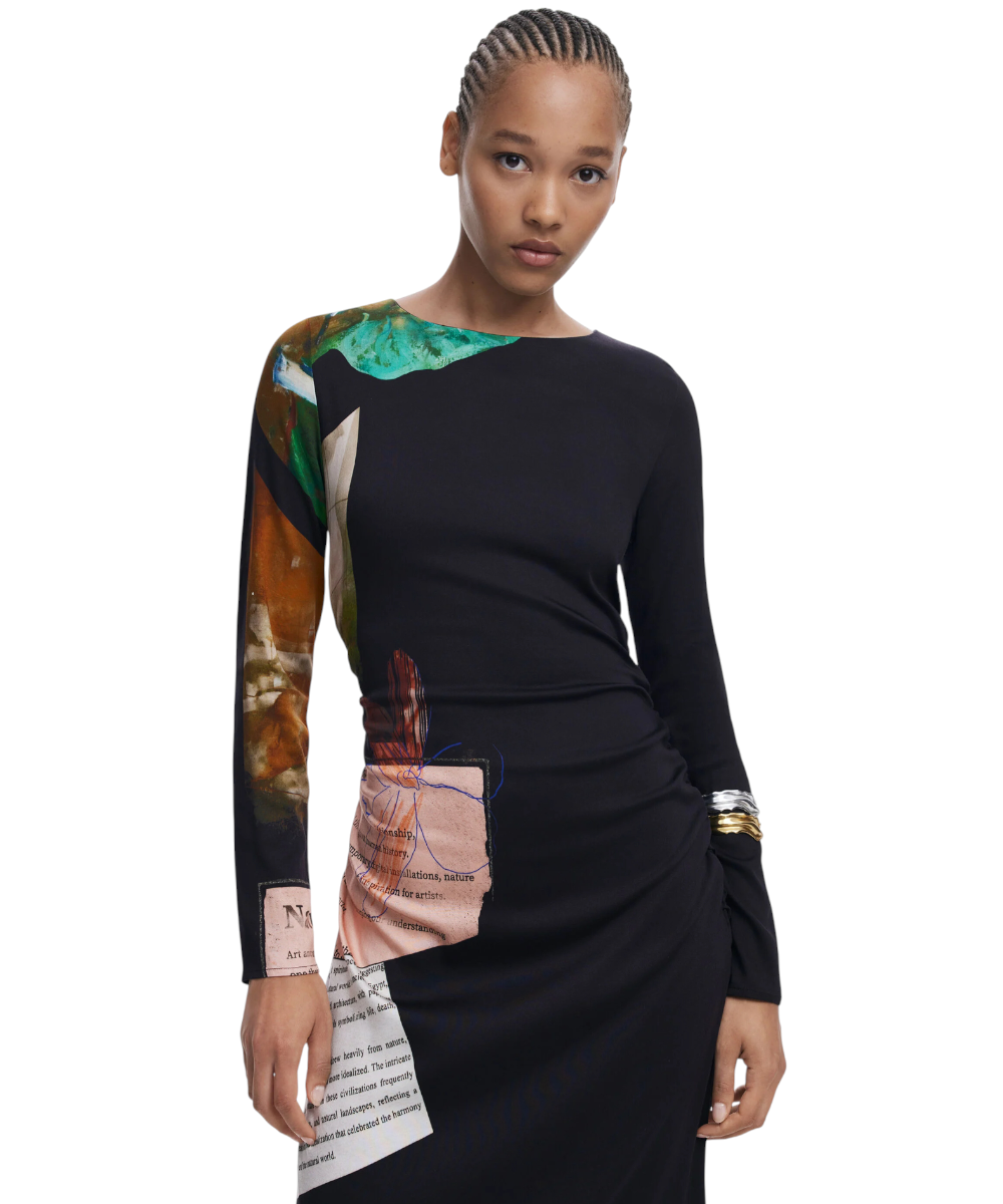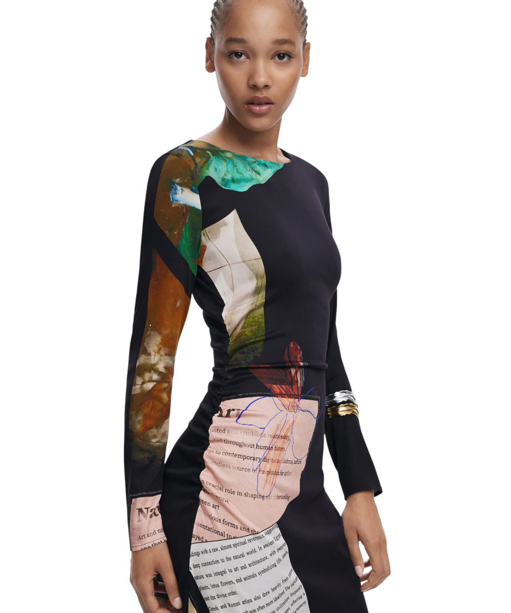 Φόρεμα της Desigual με μακριά μανίκια, στρογγυλή λαιμόκοψη, ασύμμετρο στρίφωμα, πλαϊνές πιέτες και τύπωμα τύπου Collage.