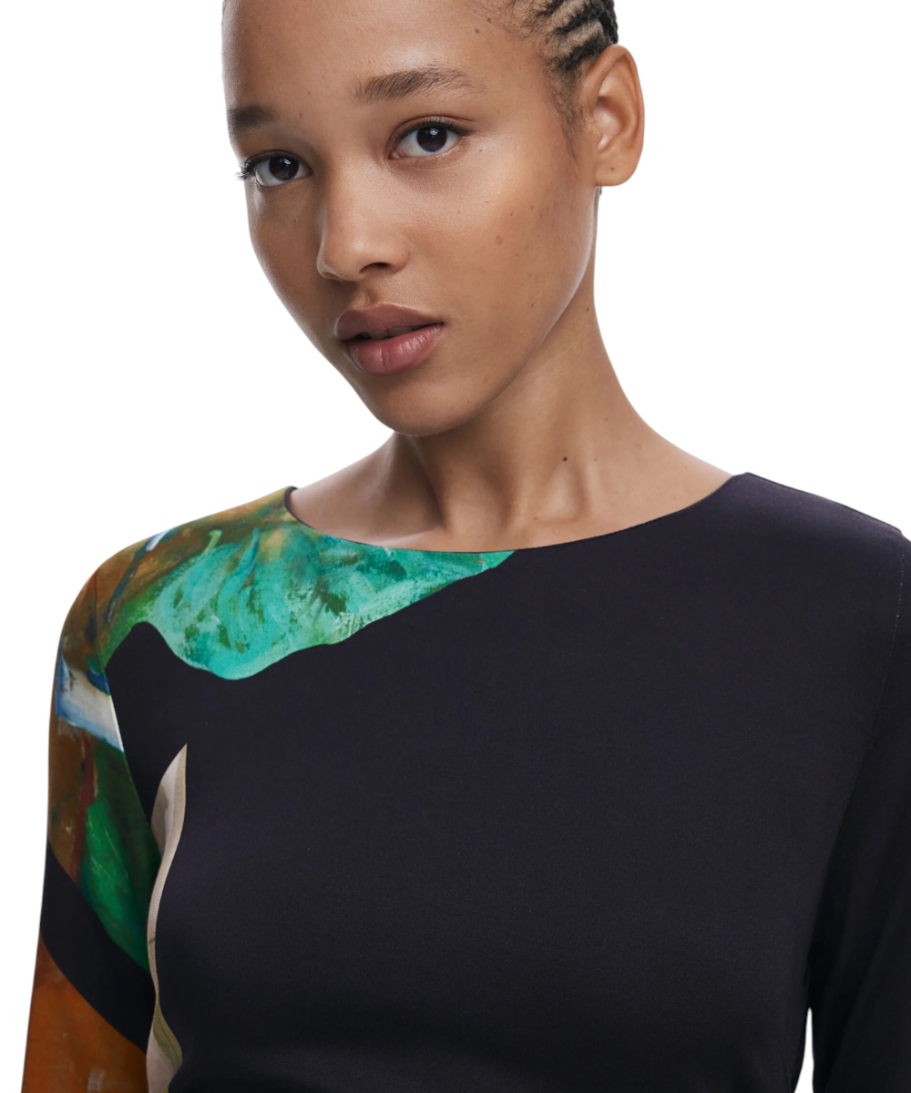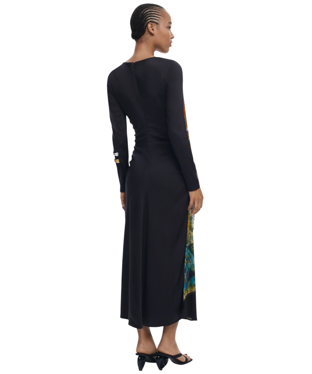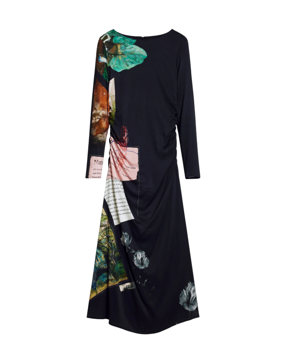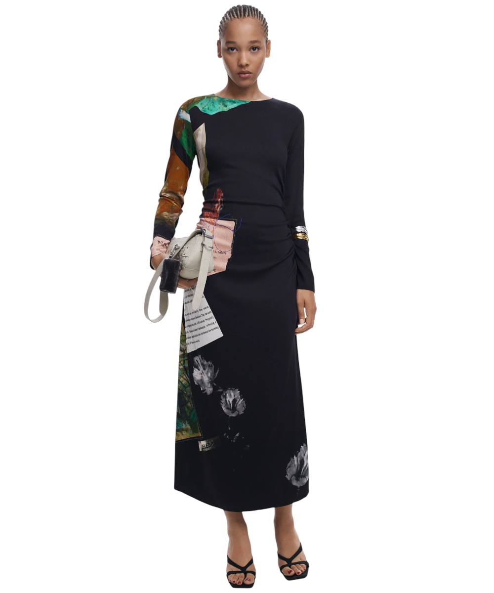 Φόρεμα της Desigual με μακριά μανίκια, στρογγυλή λαιμόκοψη, ασύμμετρο στρίφωμα, πλαϊνές πιέτες και τύπωμα τύπου Collage.