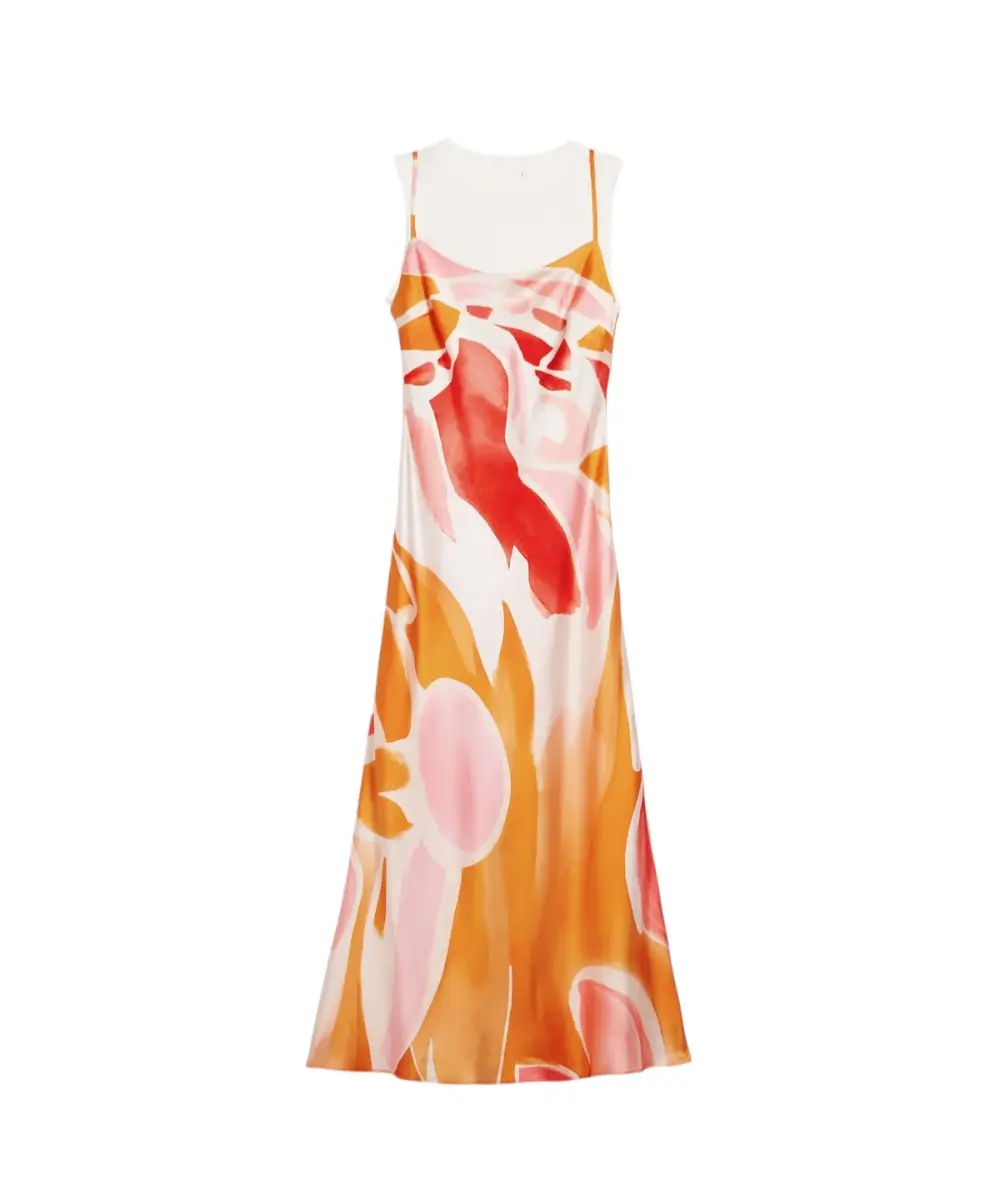 Versatile Layering: Το Wave σύνολο σάς επιτρέπει να φοράτε το φόρεμα μόνο του με τις λεπτές τιράντες για μια βραδινή εμφάνιση, ή σε συνδυασμό με την αμάνικη μπλούζα από μέσα για ένα πιο προσεγμένο και urban look. Το floral μοτίβο σε πορτοκαλί και πολύχρωμες αποχρώσεις αναδεικνύεται μοναδικά με χρυσά κοσμήματα.