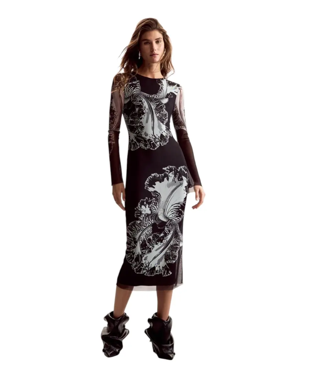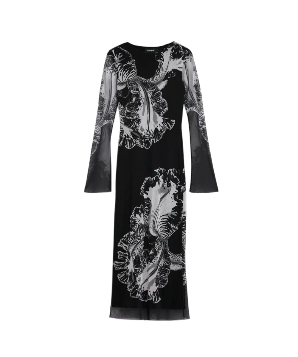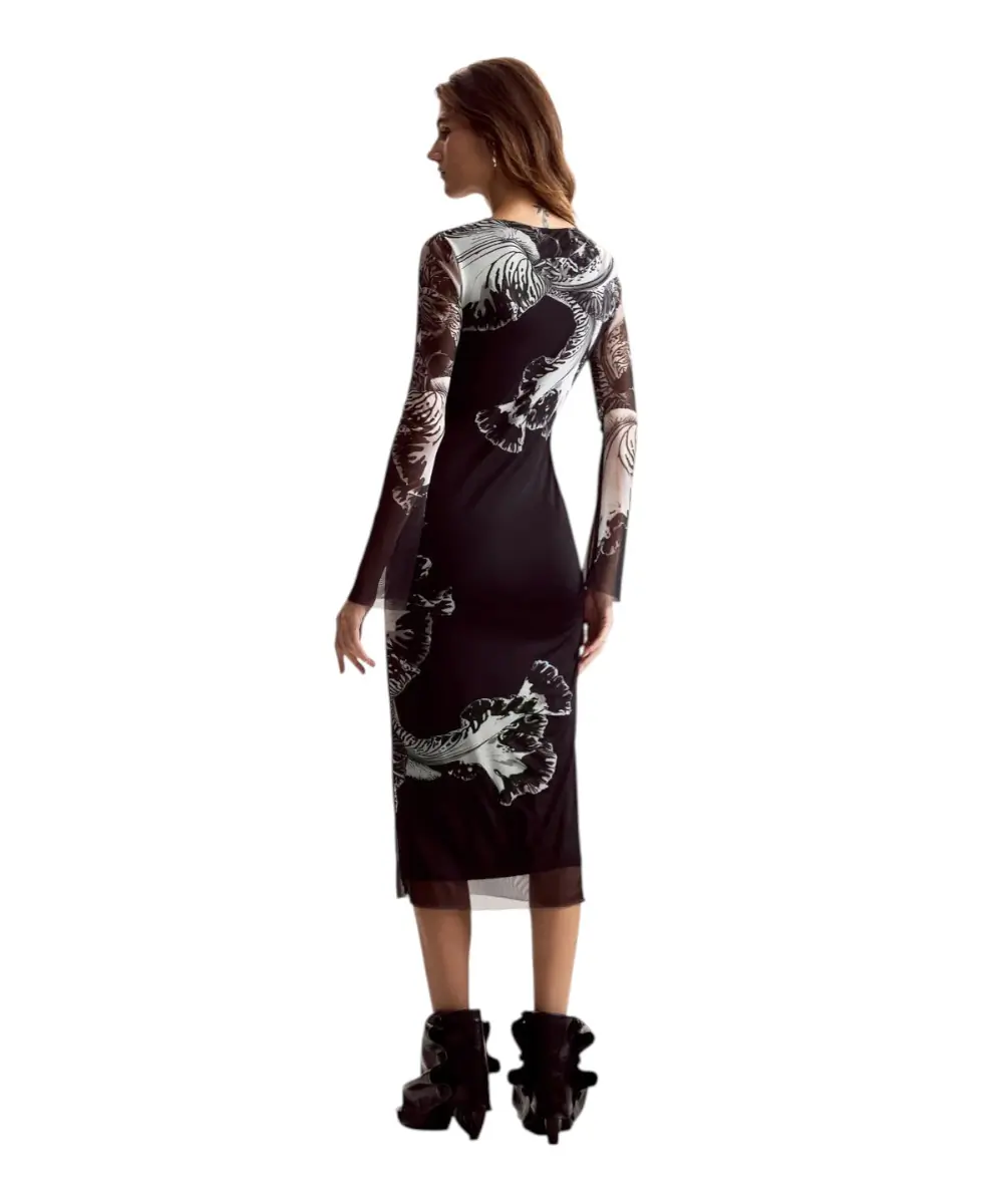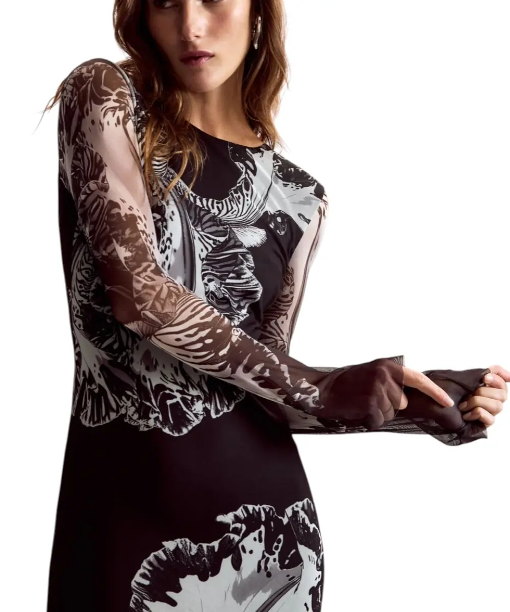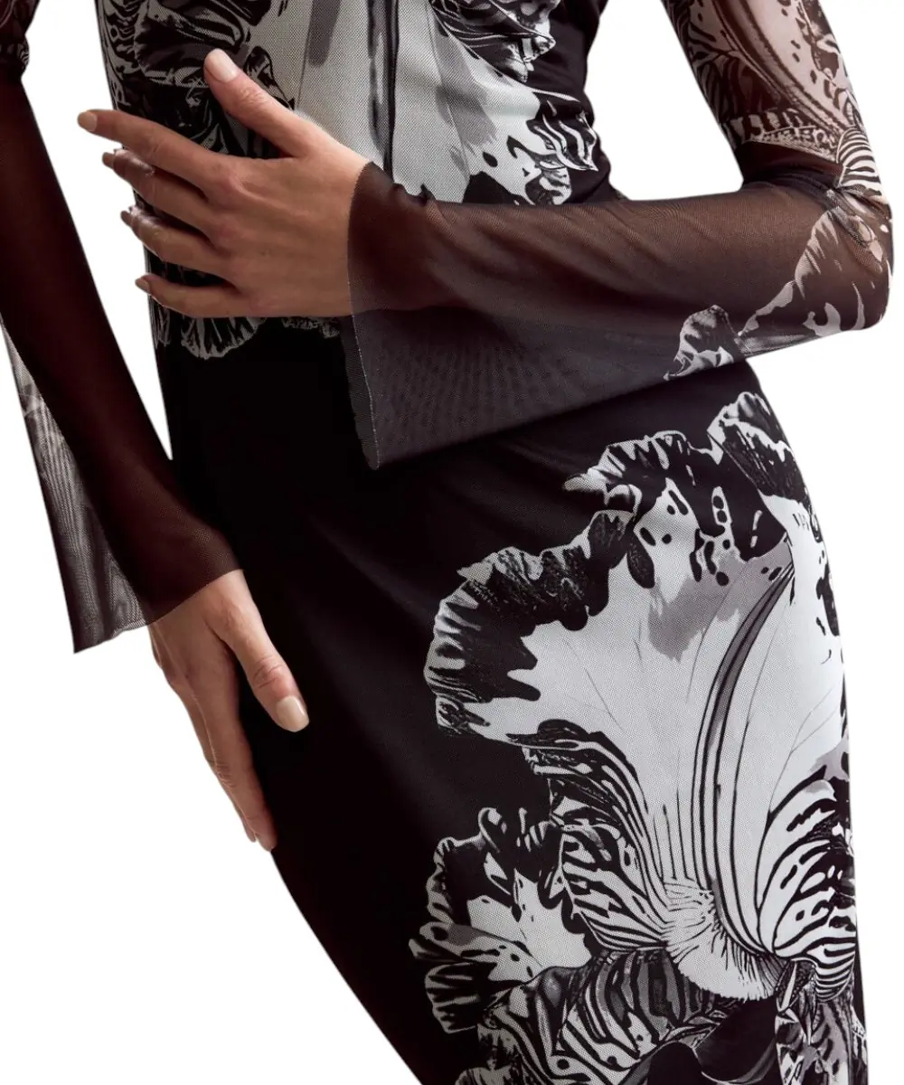 Το φόρεμα Reims Lacroix από τη συλλογή Άνοιξη/Καλοκαίρι 2026 είναι ένα κομμάτι-έργο τέχνης, αποτέλεσμα της συνεργασίας με τον M. Christian Lacroix. Σε μαύρη (NE2000) βάση, αυτό το maxi φόρεμα από τούλι συνδυάζει τη μυστηριώδη γοητεία της διαφάνειας με την εκρηκτική δημιουργικότητα των μεγεθυμένων floral μοτίβων του οίκου Lacroix.
