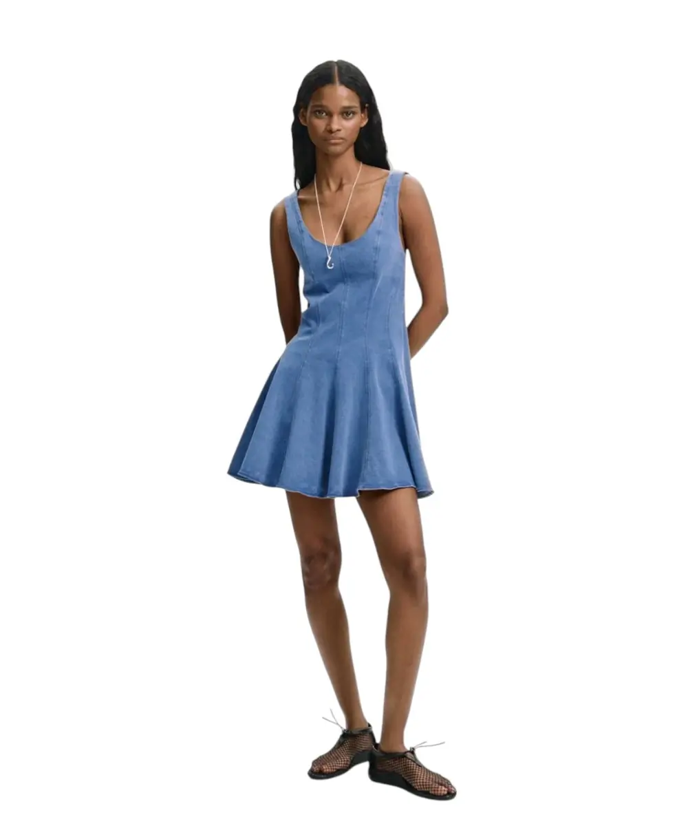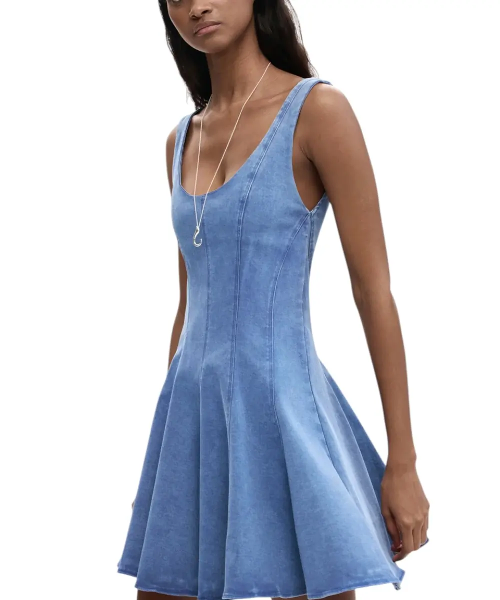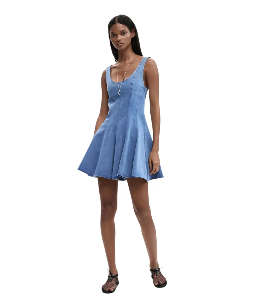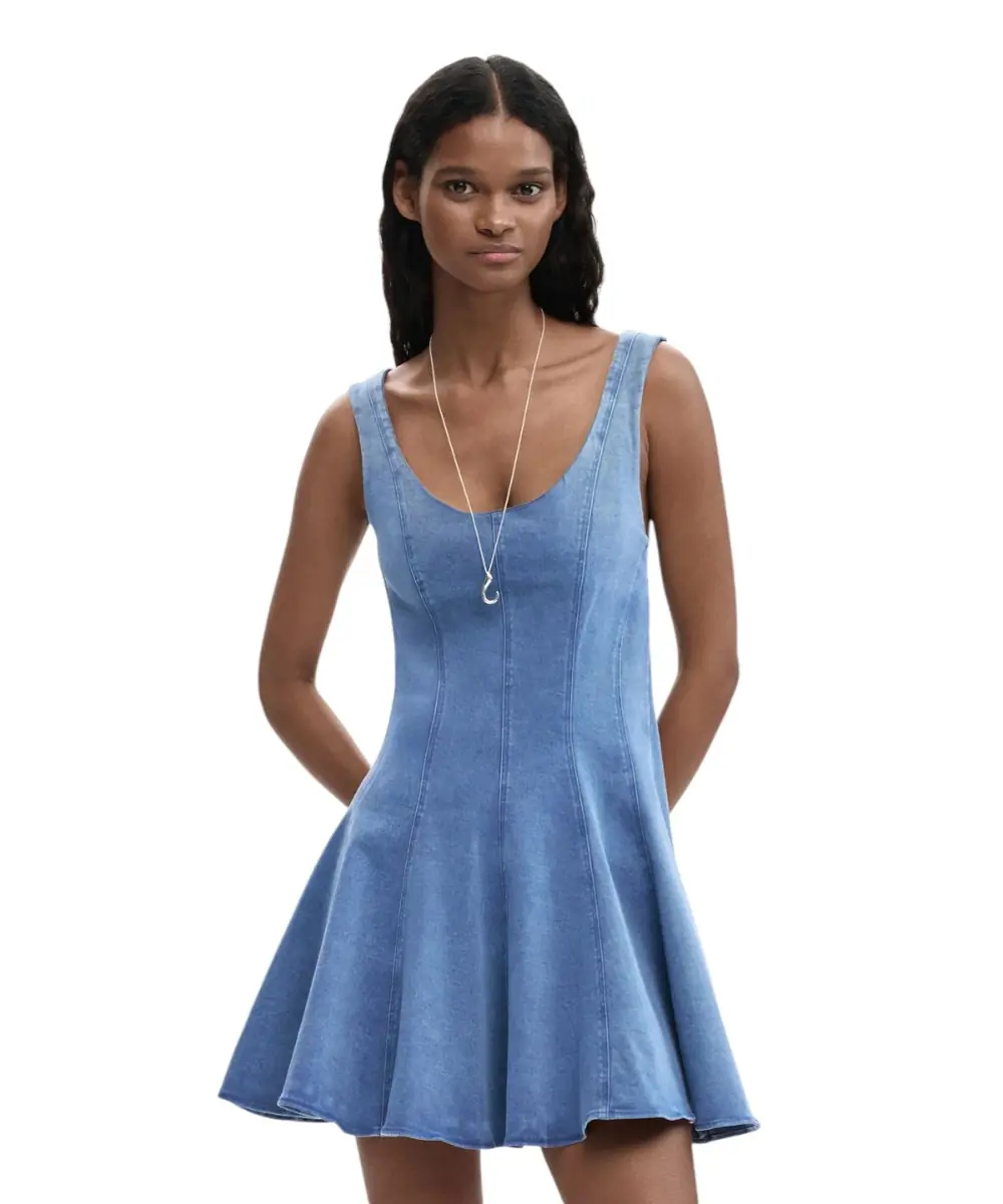 Urban Denim Look: Το εφέ ξεπλυμένου τζιν σε μπλε αποχρώσεις αναδεικνύεται μοναδικά με λευκά sneakers ή δερμάτινα σανδάλια σε ταμπά χρώμα. Η skater γραμμή του φορέματος προσδίδει κίνηση και μια παιχνιδιάρικη διάθεση που ταιριάζει απόλυτα στις ανοιξιάτικες βόλτες.