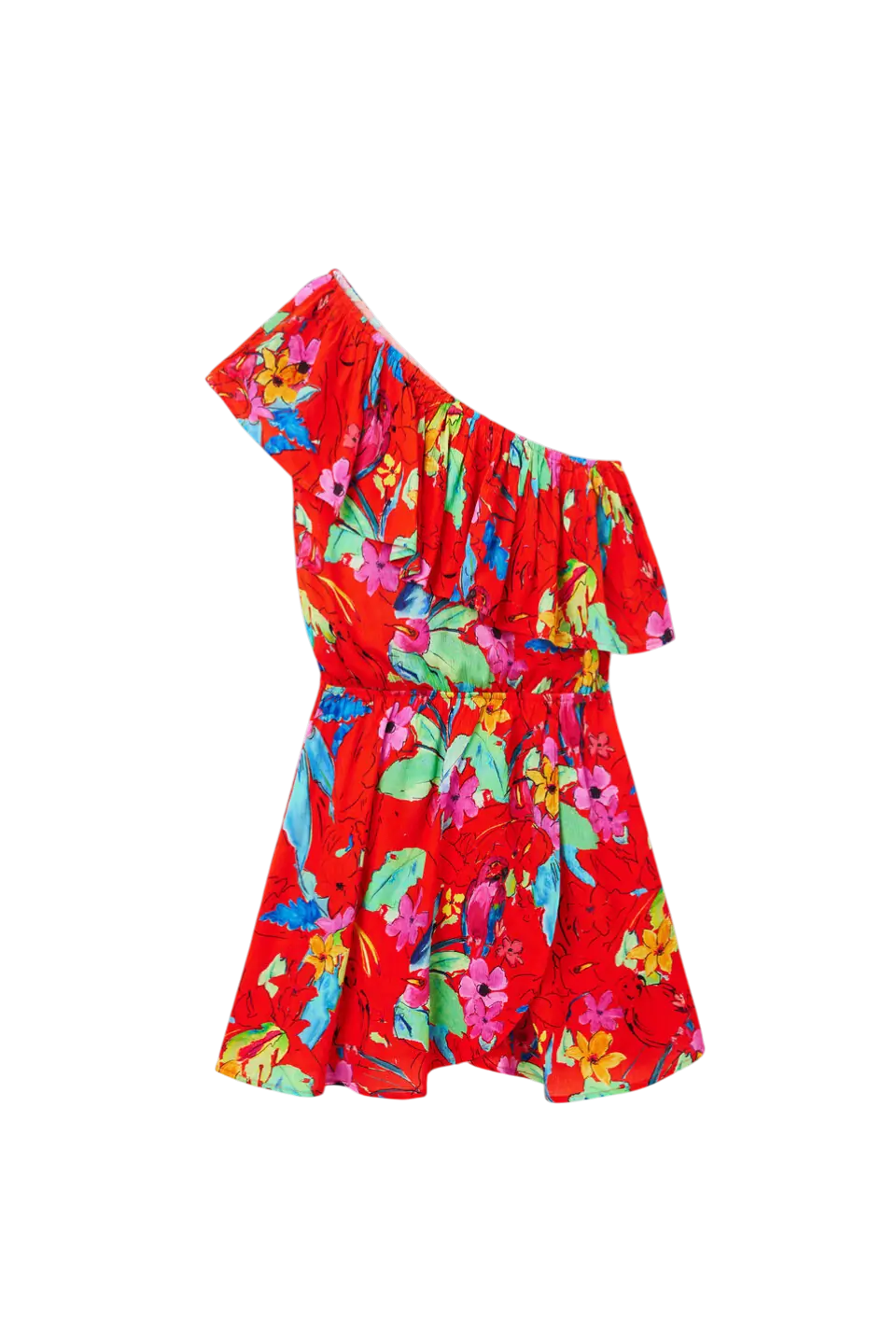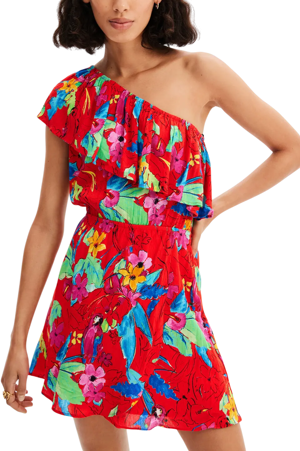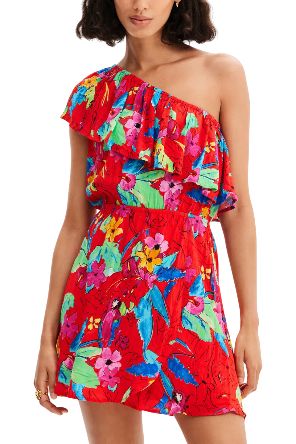 Το κοντό φόρεμα Rosso από τη συλλογή Άνοιξη/Καλοκαίρι είναι μια ωδή στην καλοκαιρινή ενέργεια και το καλλιτεχνικό στυλ. Σε κόκκινη βάση με ένα εντυπωσιακό τροπικό τύπωμα που θυμίζει υδατογραφία (watercolour-effect), αυτό το ασύμμετρο κομμάτι συνδυάζει τη θηλυκότητα των βολάν με τη δυναμική κίνηση μιας κρουαζέ φούστας.