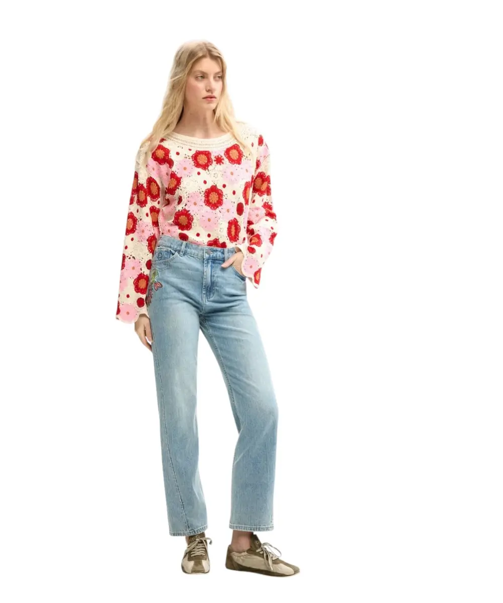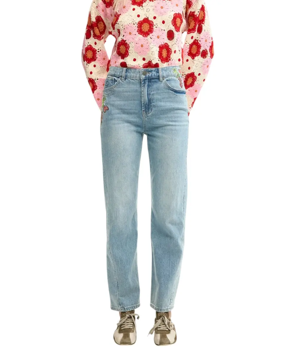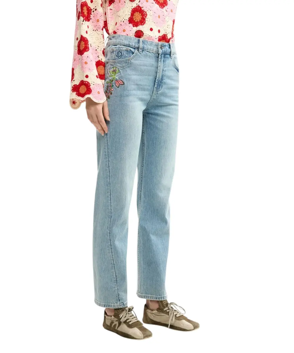 Τα jeans Flora από τη συλλογή Άνοιξη/Καλοκαίρι 2026 επαναπροσδιορίζουν το κλασικό denim μέσα από μια καλλιτεχνική ματιά. Σε μπλε (AZ5053) απόχρωση, αυτό το παντελόνι σε ίσια γραμμή ξεχωρίζει για τις διακοσμητικές του ραφές και τα περίτεχνα κεντημένα λουλούδια στη ζώνη και την πίσω τσέπη, προσφέροντας μια διακριτική αλλά απόλυτα θηλυκή λεπτομέρεια.