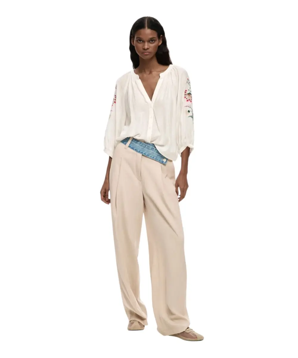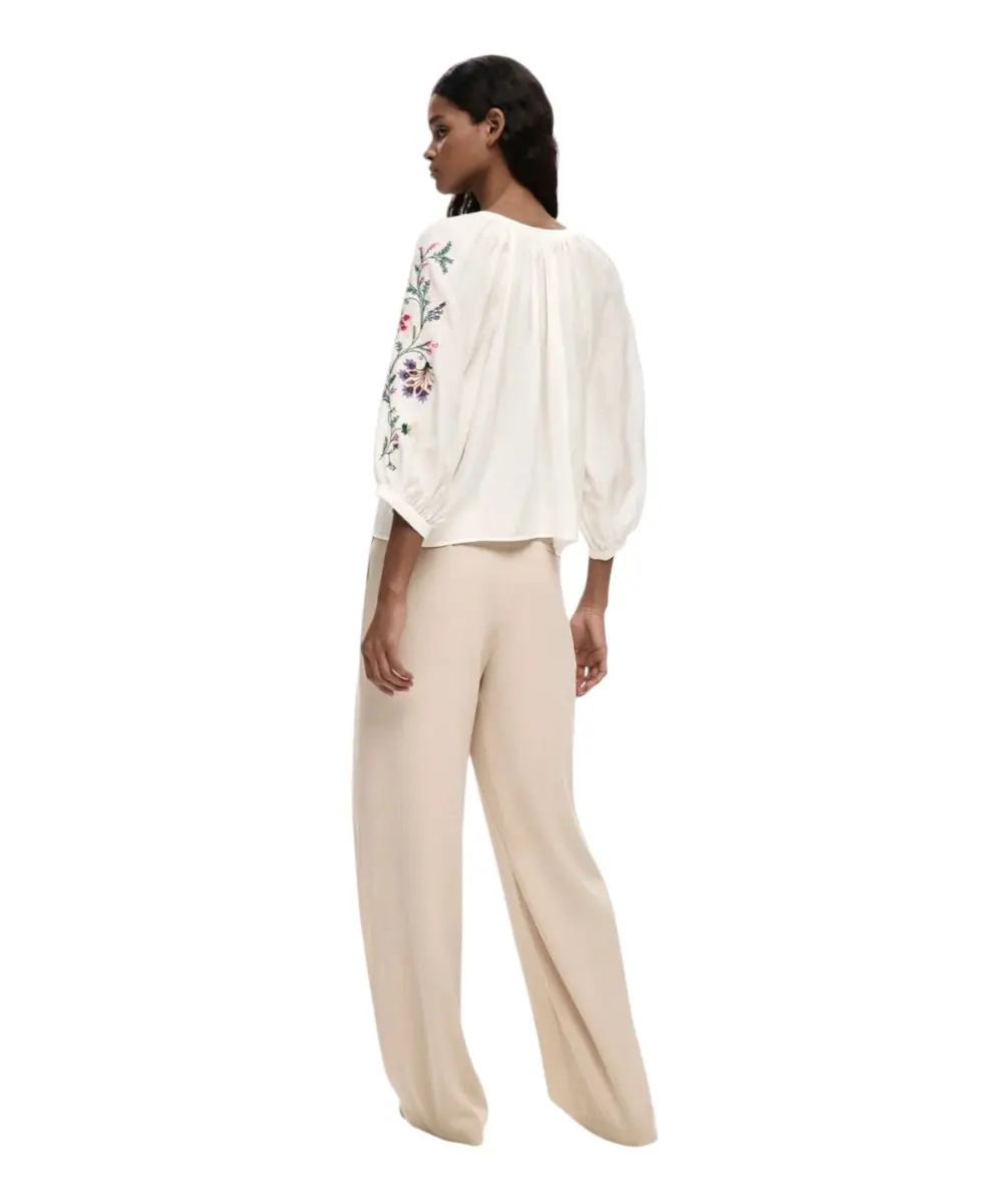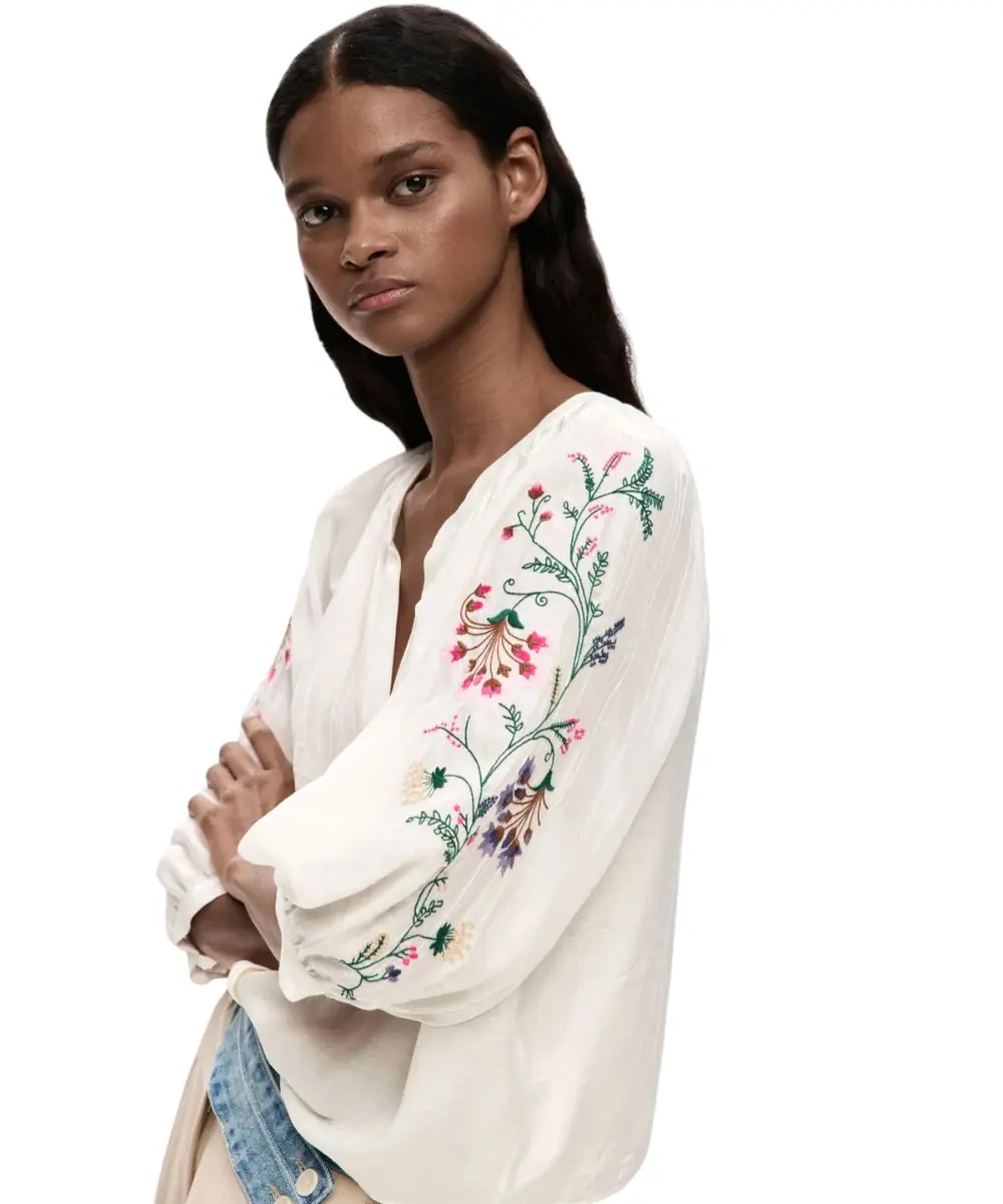 Romantic Spring Look: Η καθαρή λευκή απόχρωση της Blus Roman αναδεικνύεται μοναδικά με ένα τζιν παντελόνι σε μπλε ή γαλάζιο χρώμα. Τα κεντήματα στα μανίκια προσθέτουν την απαραίτητη ένταση, καθιστώντας την ιδανική για προσεγμένες καθημερινές εμφανίσεις.