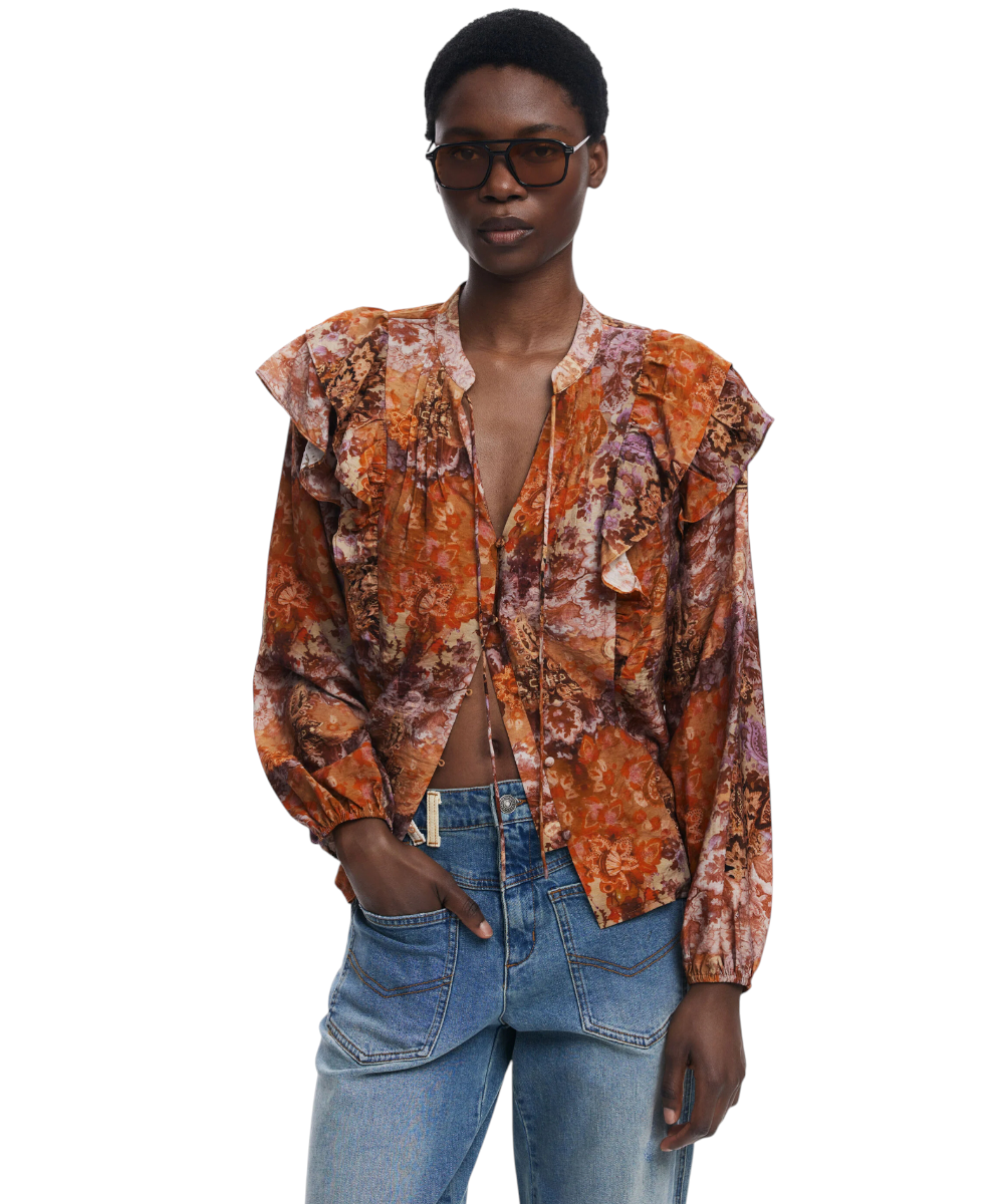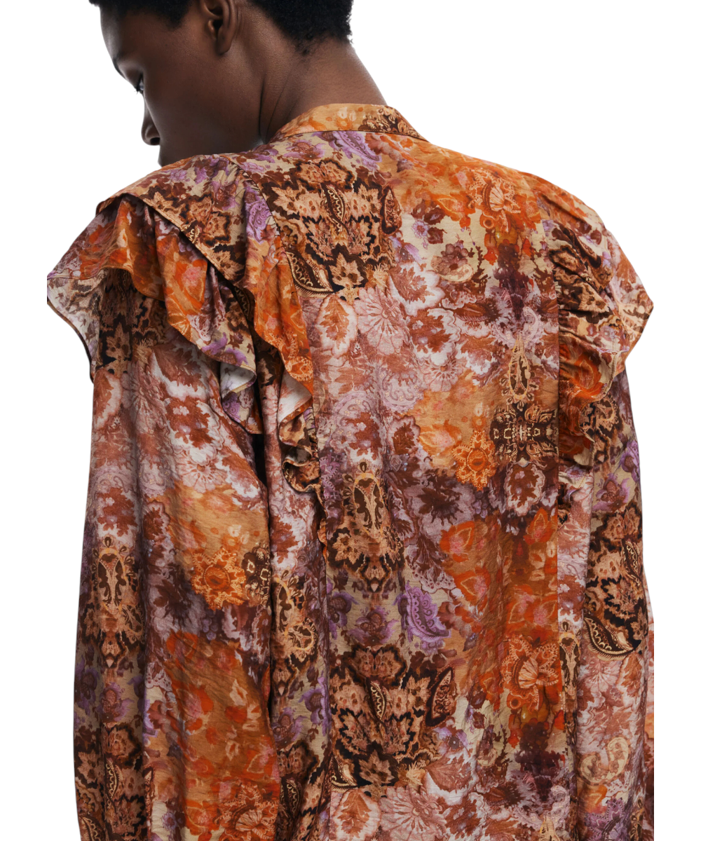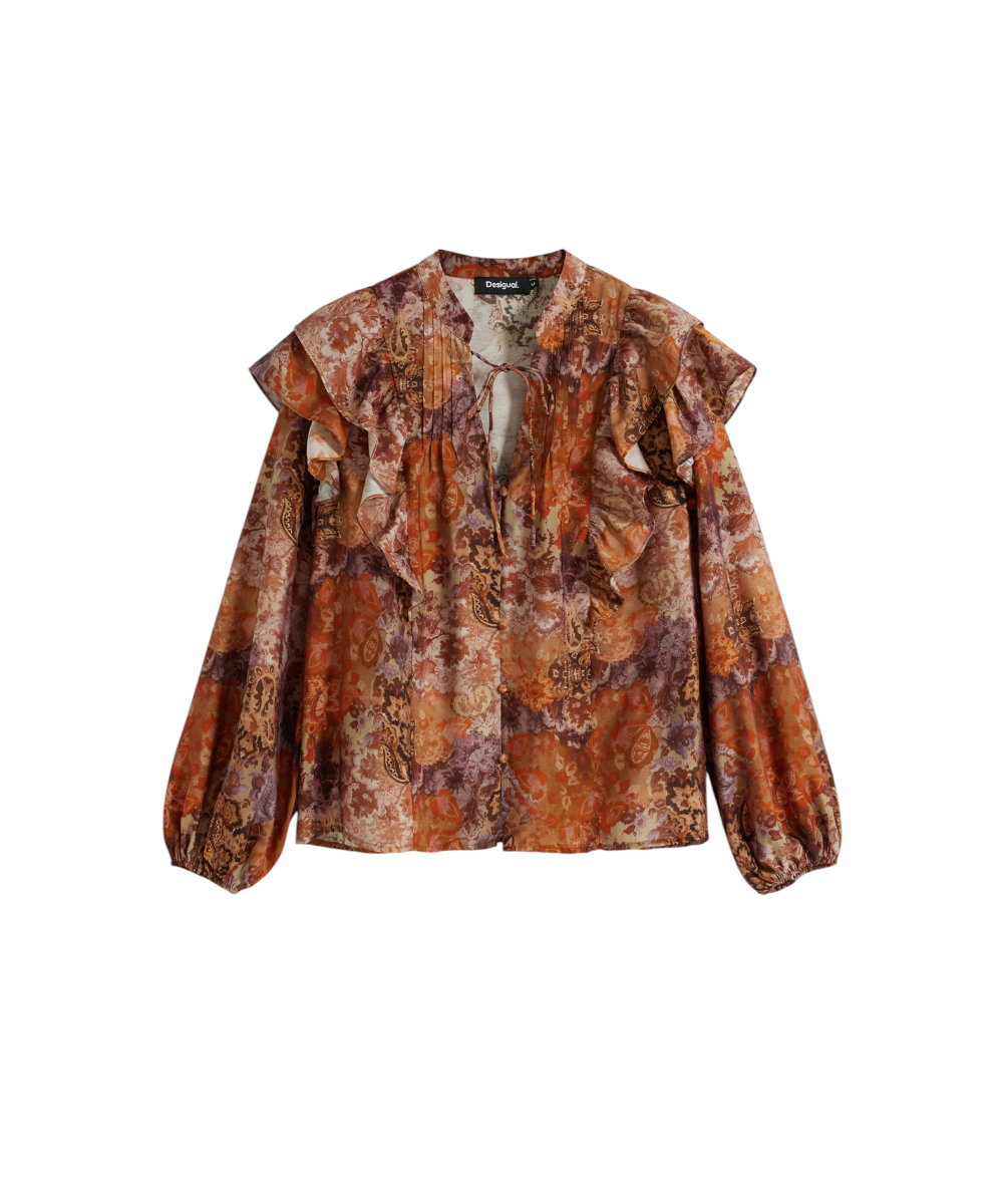 Ρομαντική μπλούζα της Desigual με μακριά μανίκια, ντεκολτέ σε σχήμα V με λεπτομέρεια κορδονιού, λεπτομέρεια βολάν και σχέδιο Paisley σε πορτοκαλί αποχρώσεις.