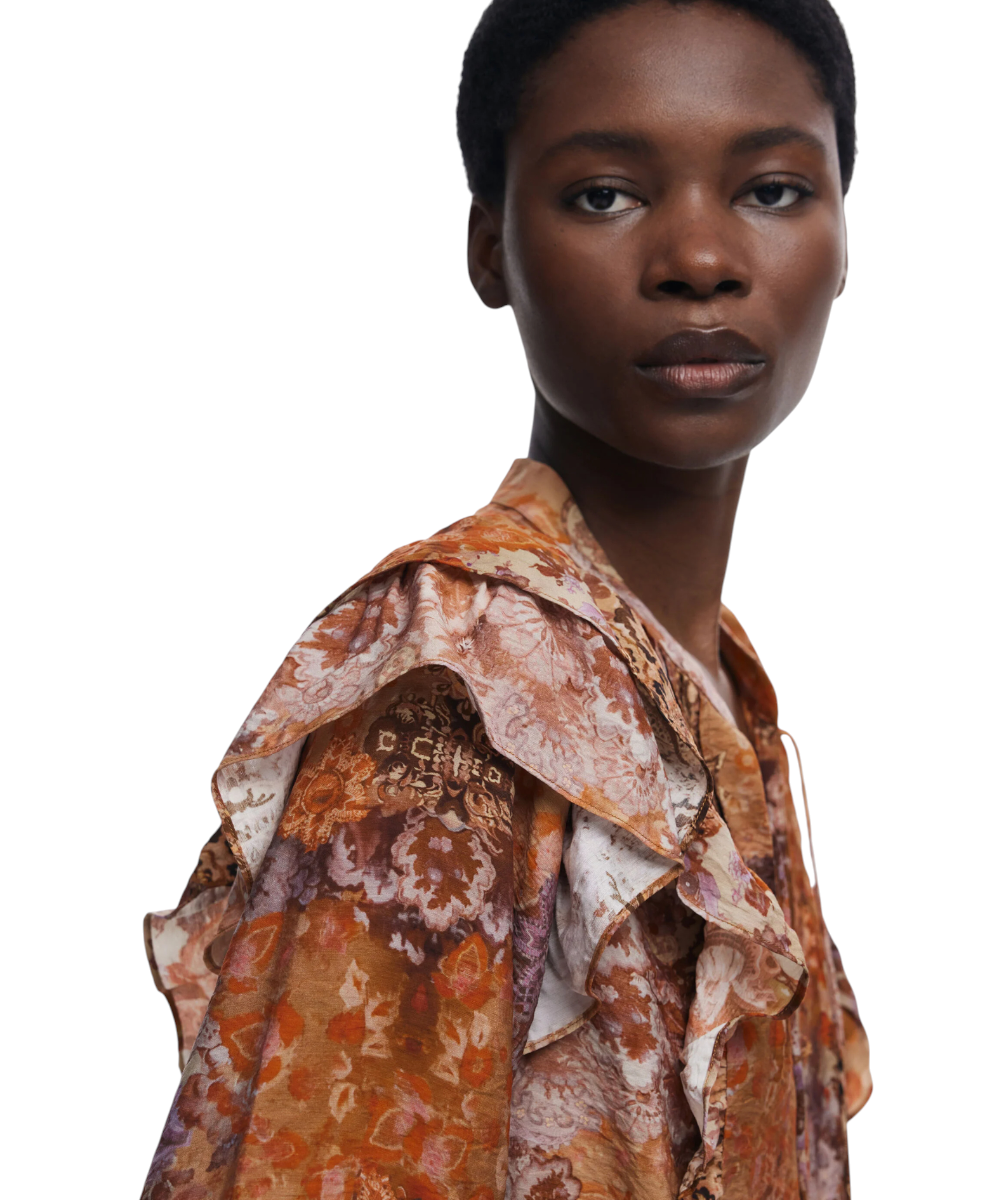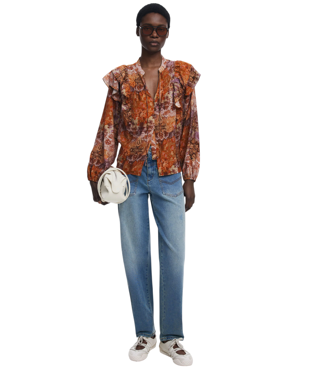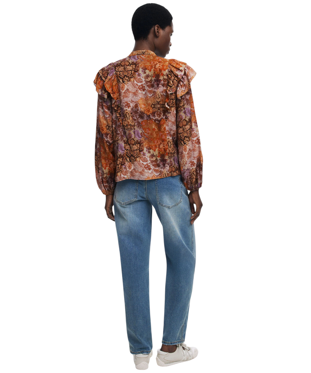 Ρομαντική μπλούζα της Desigual με μακριά μανίκια, ντεκολτέ σε σχήμα V με λεπτομέρεια κορδονιού, λεπτομέρεια βολάν και σχέδιο Paisley σε πορτοκαλί αποχρώσεις.