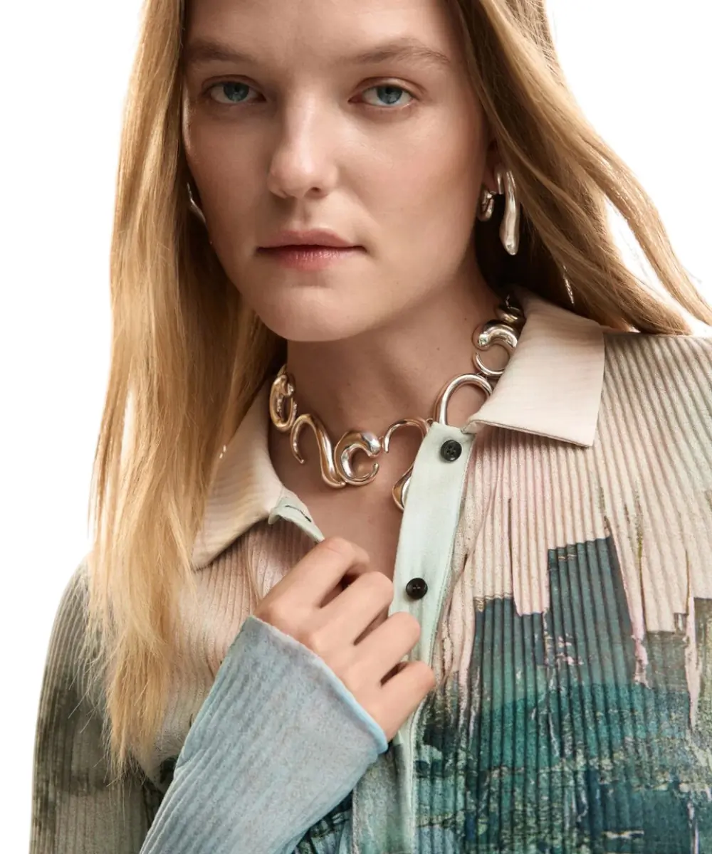 Textured Layering: Ταιριάζει ιδανικά κάτω από ένα γιλέκο ή μια ζακέτα σε french terry σε γκρι ή μαύρο χρώμα. Η αντίθεση του τυπωμένου πολυεστέρα με μια πιο ματ υφή δημιουργεί ένα ενδιαφέρον οπτικό αποτέλεσμα που ταιριάζει σε όλες τις ώρες της ημέρας.