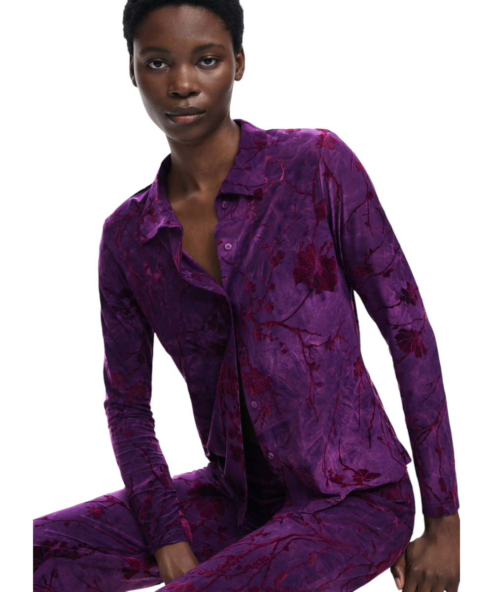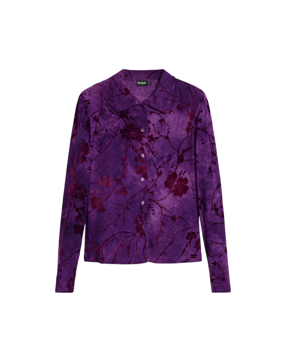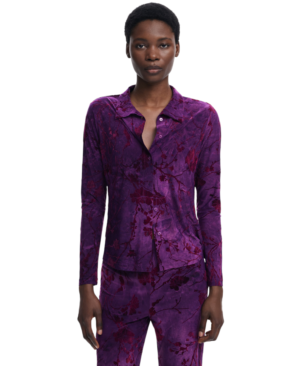 Μπλούζα της Desigual με υφή μακρυμάνικη, με μπροστινό κούμπωμα και λουλουδάτο σχέδιο εμπνευσμένο από την Ανατολή σε μοβ αποχρώσεις.