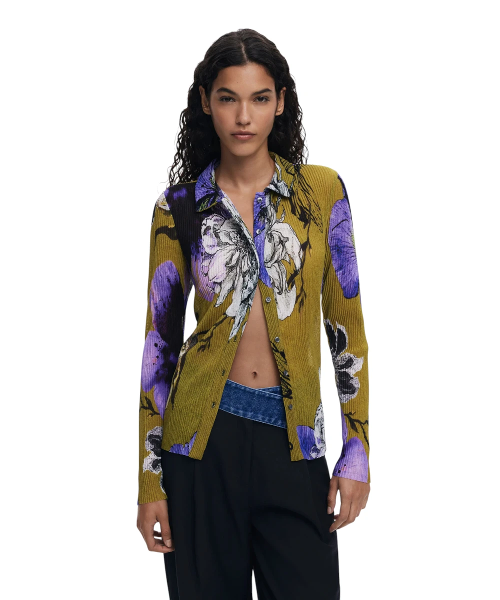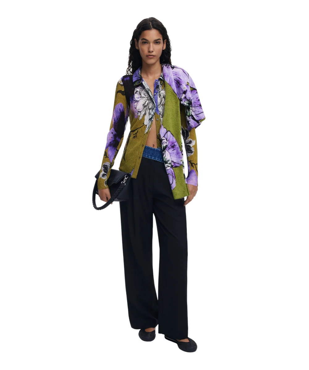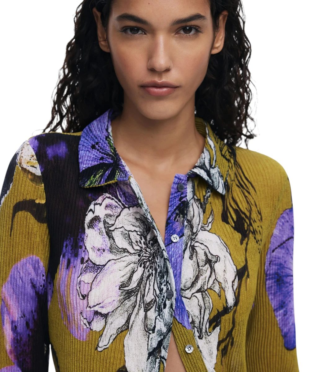 Εφαρμοστό μπλουζάκι της Desigual με πλισέ υφή, μακρυμάνικο, με μπροστινό κούμπωμα και λουλουδάτο σχέδιο σχεδιασμένο από τον Monsieur Christian Lacroix.