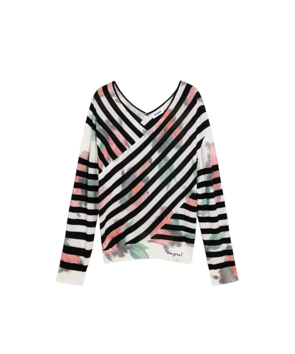 Sophisticated Graphic: Οι οριζόντιες ρίγες πάνω από το floral μοτίβο δίνουν μια σύγχρονη νότα. Συνδυάστε τη με ένα μαύρο υφασμάτινο παντελόνι ή μια midi πλισέ φούστα για ένα κομψό total look που παίζει με τις υφές.