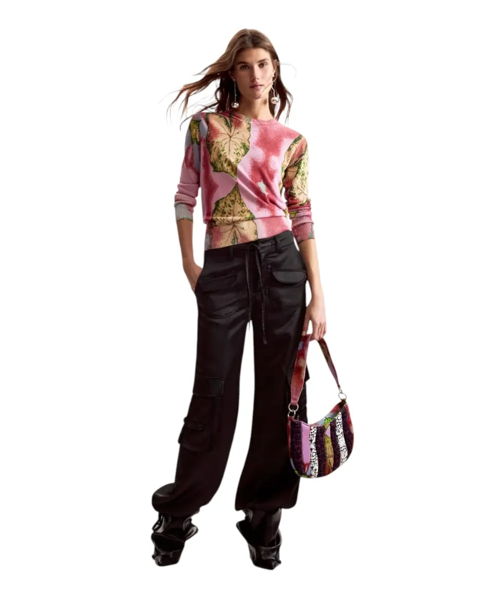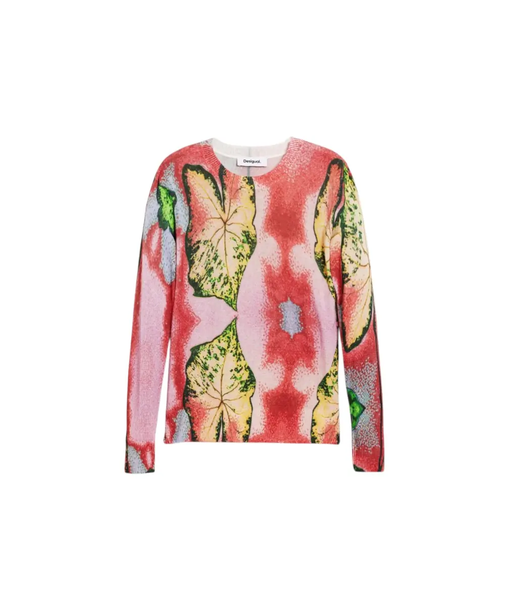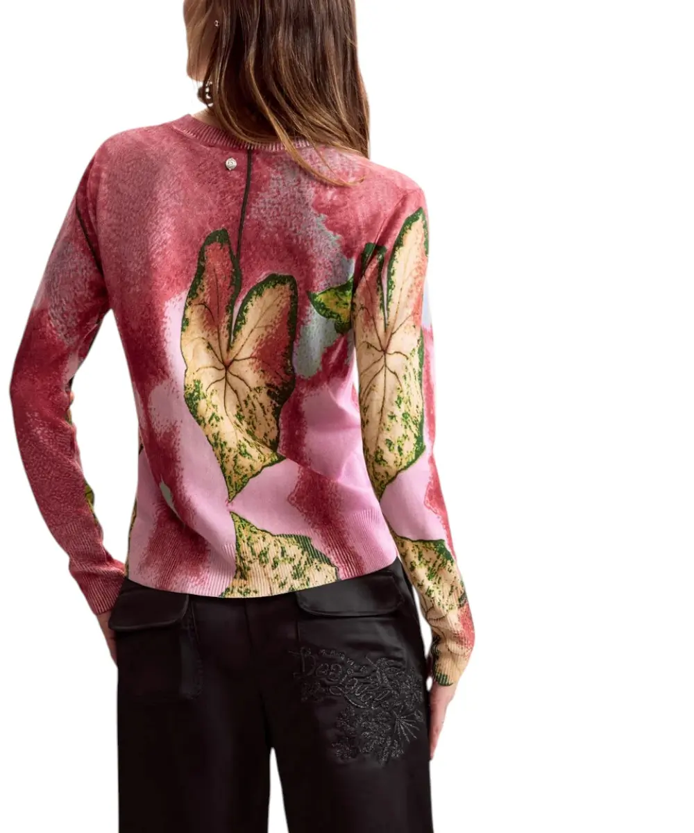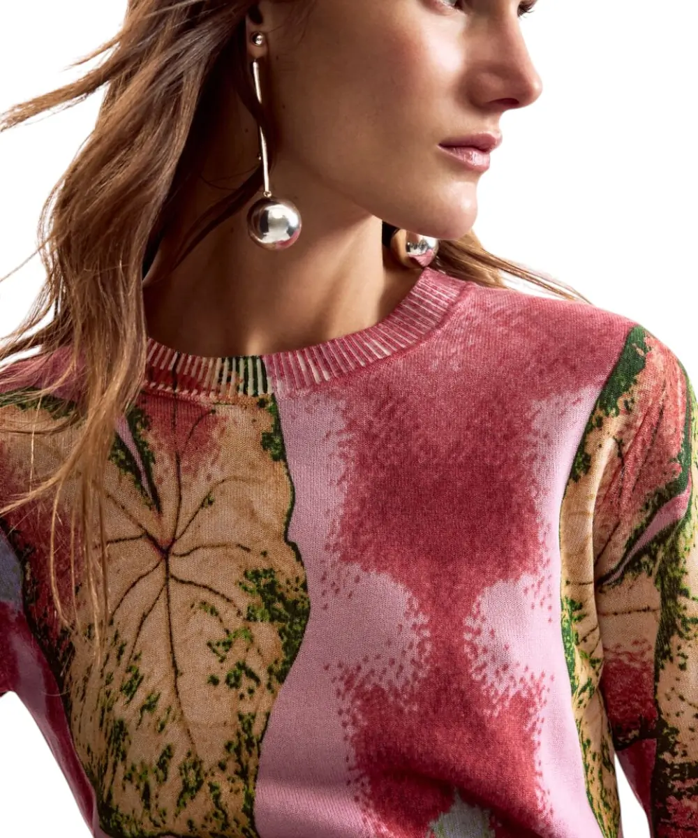 Η πλεκτή μπλούζα Leaf Lacroix από τη συλλογή Άνοιξη/Καλοκαίρι 2026 αποτελεί ακόμα μια εντυπωσιακή δημιουργία του Christian Lacroix. Με ένα καλλιτεχνικό αφηρημένο τύπωμα που καλύπτει ολόκληρο το ένδυμα, αυτό το κομμάτι συνδυάζει τις αποχρώσεις του ροζ και του πράσινου, δημιουργώντας ένα μοναδικό οπτικό αποτέλεσμα σε πλέξη υψηλής ποιότητας.