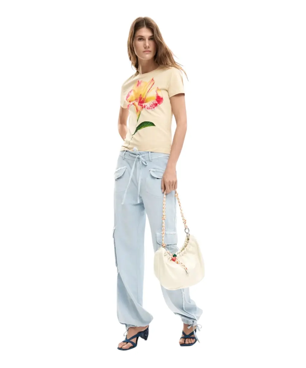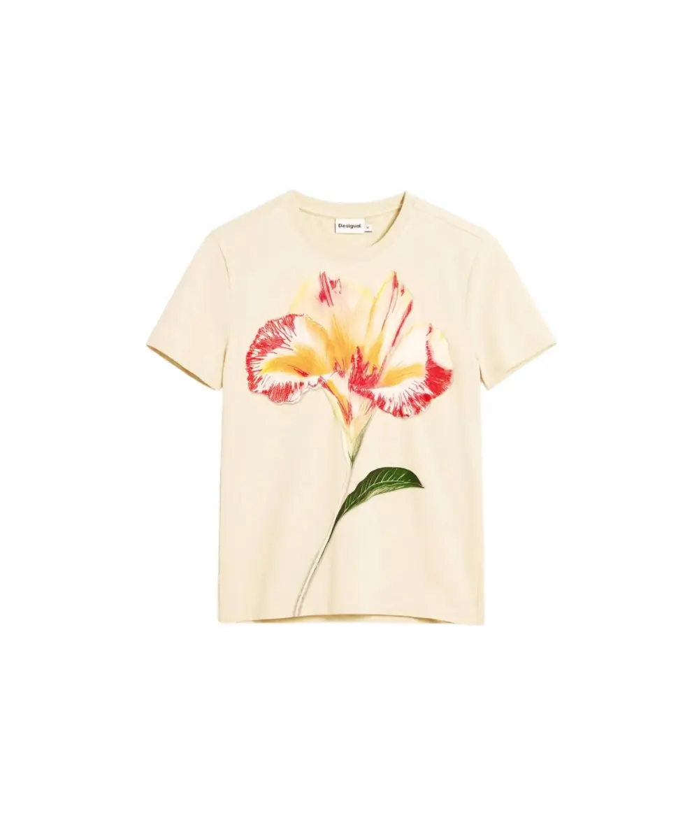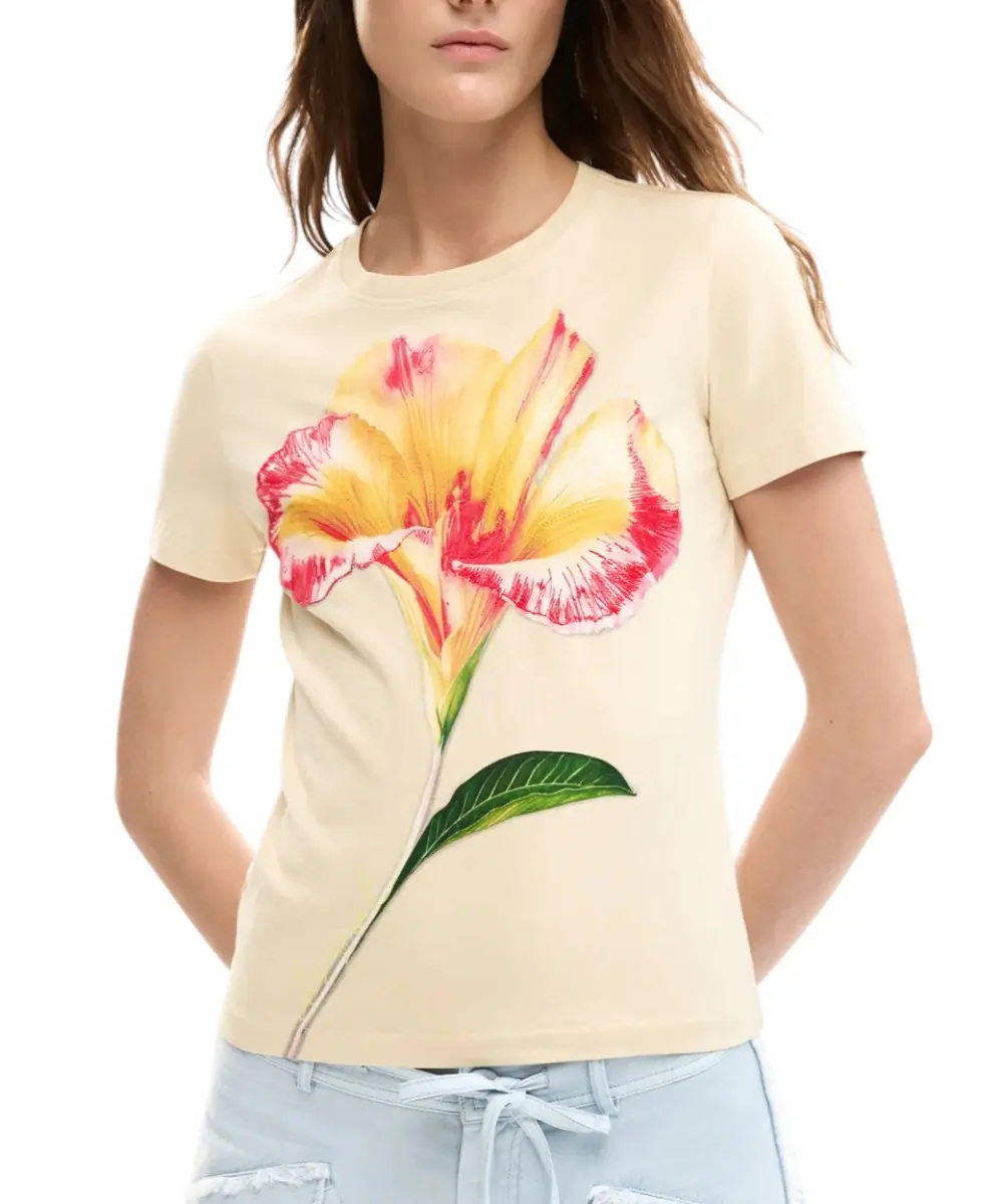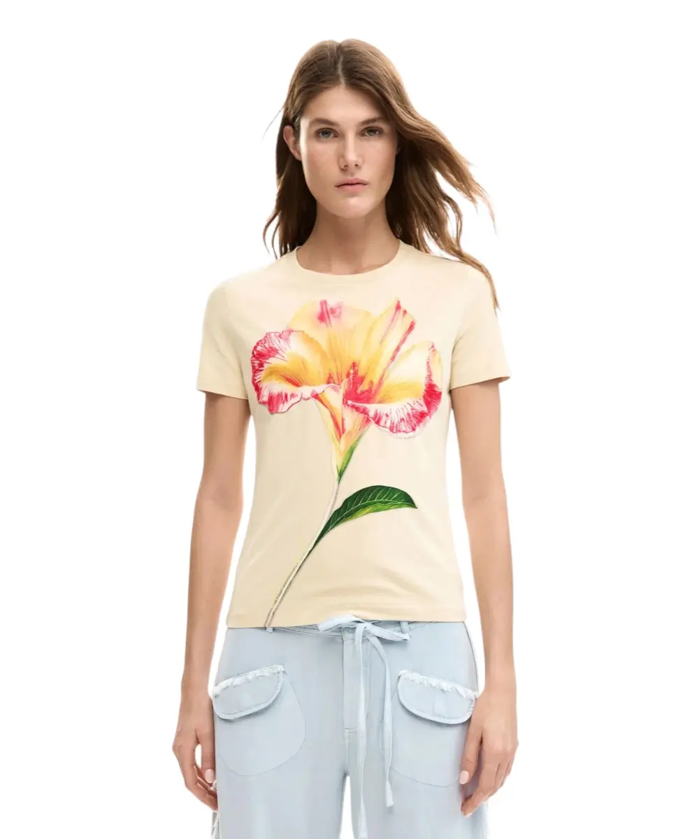 Το T-shirt Estocolmo από τη συλλογή Άνοιξη/Καλοκαίρι 2026 ξεχωρίζει για τη γλυκιά μπεζ (BE1001) βάση του, η οποία λειτουργεί ως ο τέλειος καμβάς για το πολύχρωμο λουλούδι ιβίσκου. Το “hand-painted” εφέ των πινελιών συνδυάζεται με τη φυσική απόχρωση του υφάσματος, προσφέροντας ένα σοφιστικέ και ταυτόχρονα καλλιτεχνικό αποτέλεσμα.