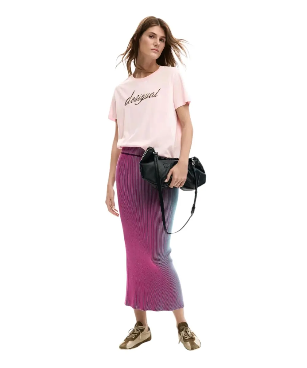 Pop & Chic: Το έντονο ροζ χρώμα αναδεικνύεται μοναδικά με ένα λευκό denim παντελόνι ή μια midi πλισέ φούστα σε μπλε σκούρο ή γκρι χρώμα. Οι χάντρες στο λογότυπο θα “δέσουν” χρωματικά με το υπόλοιπο σύνολο.