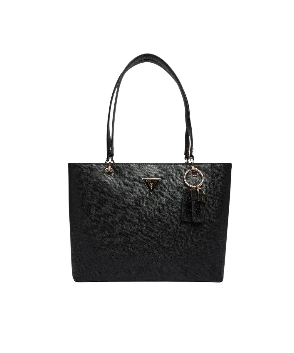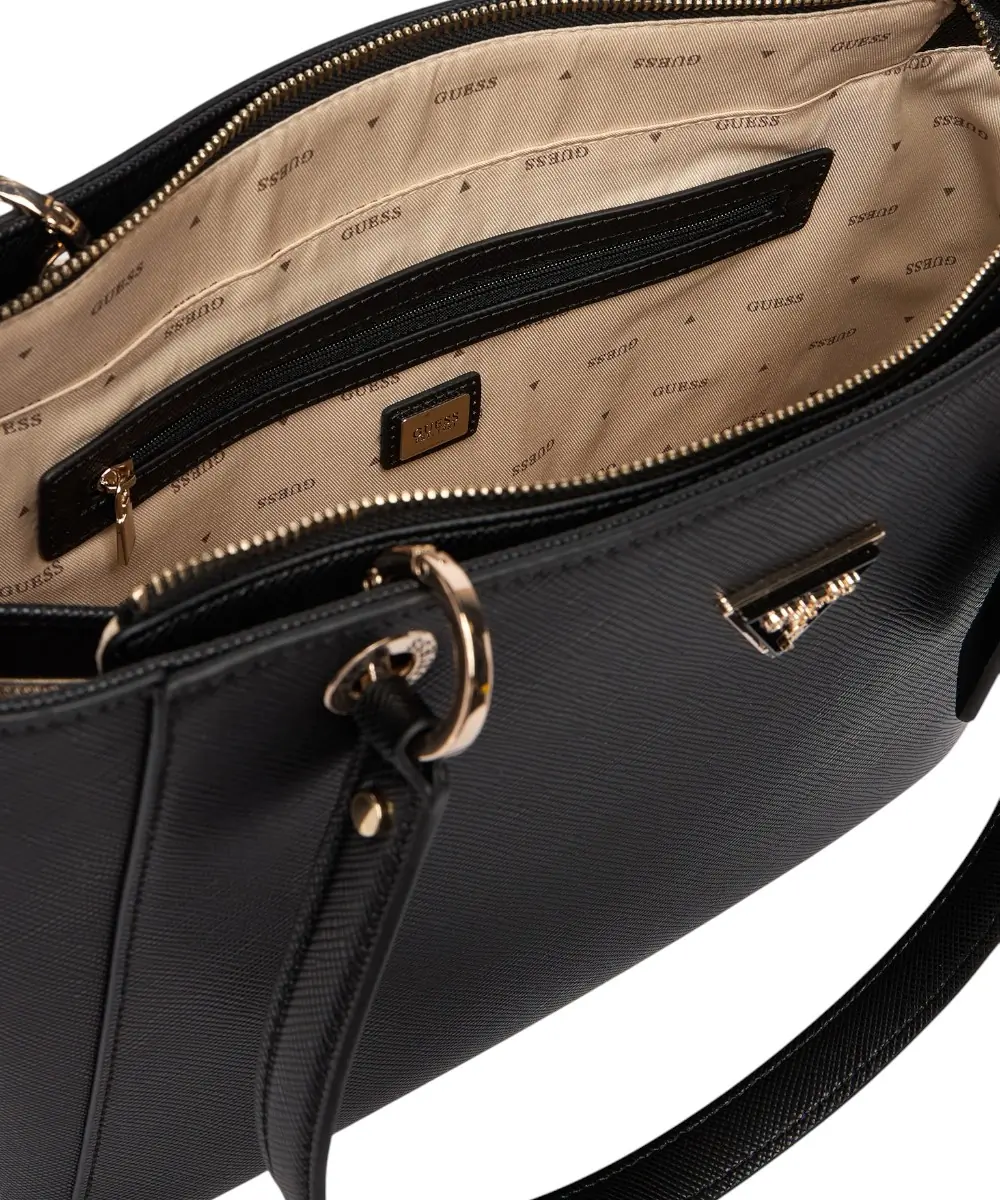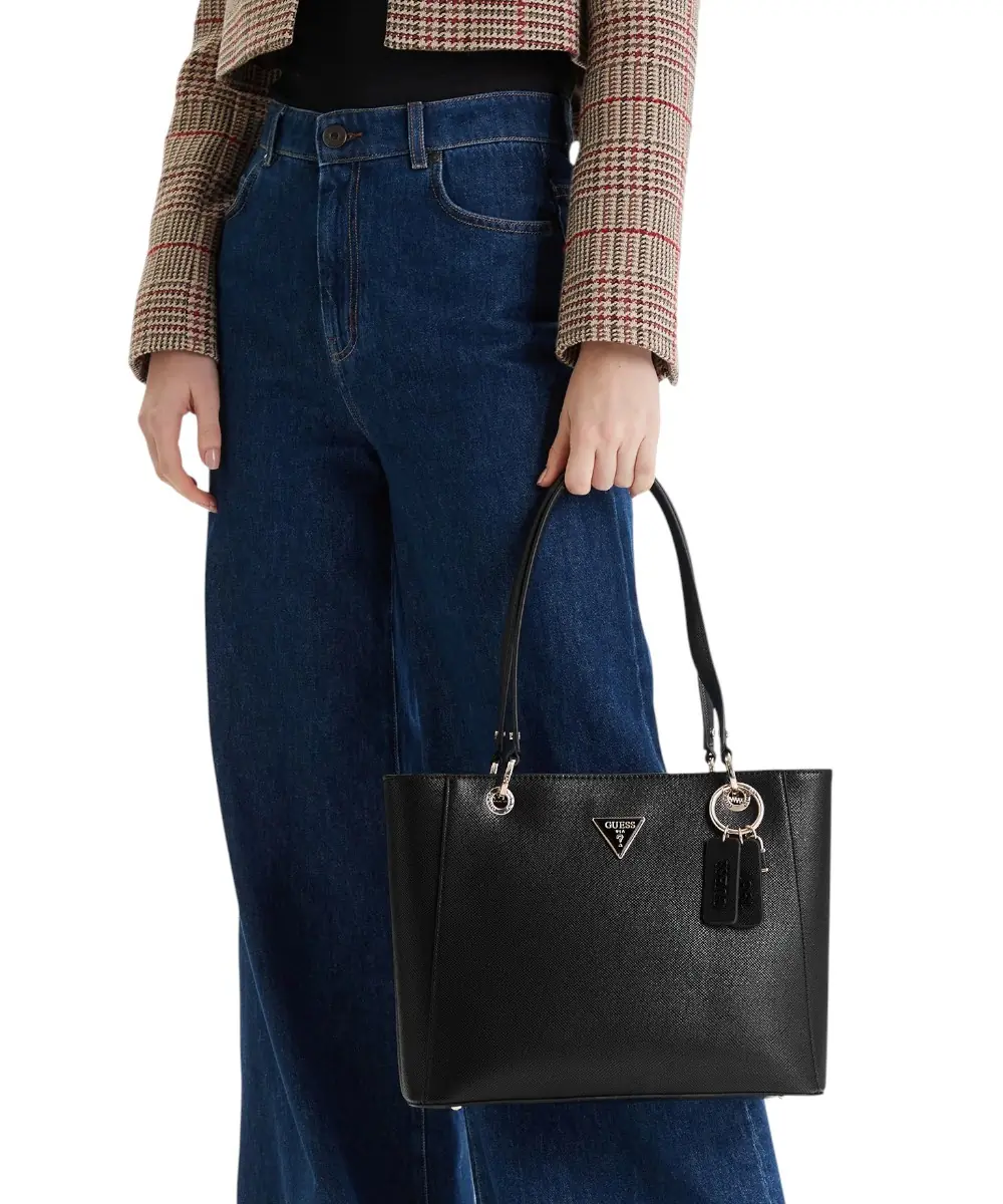 Διαθέτει κεντρικό κλείσιμο με φερμουάρ, διπλή λαβή μήκους 45 cm για μεταφορά στον ώμο ή στο χέρι, και αφαιρούμενο charm λογότυπο στη βάση της λαβής. Η τσάντα περιλαμβάνει έναν ευρύχωρο κύριο χώρο, μία εσωτερική θήκη με φερμουάρ, και μία επίπεδη θήκη, ενώ το τριγωνικό λογότυπο Guess μπροστά προσθέτει premium αισθητική.
