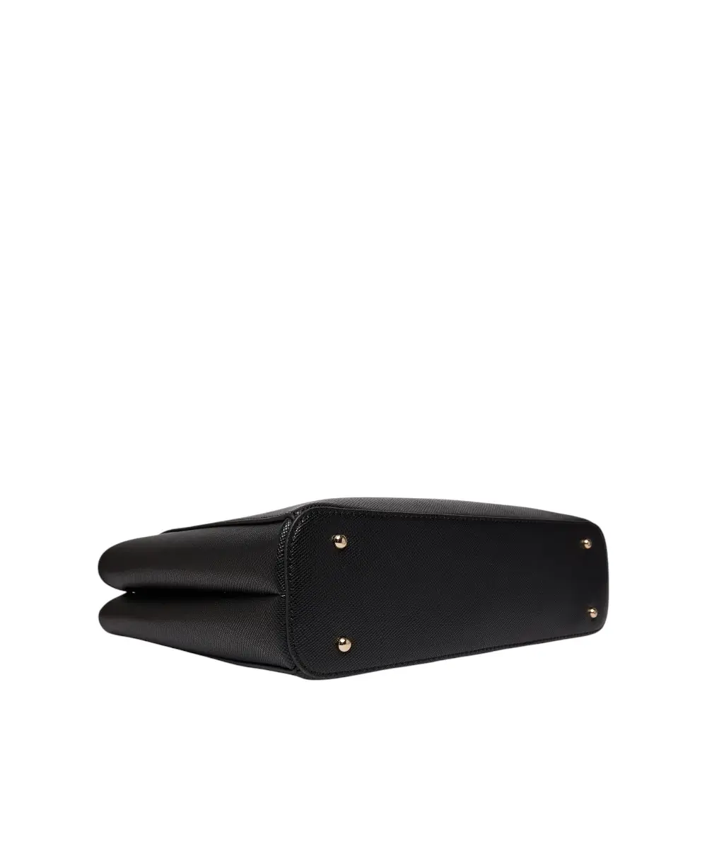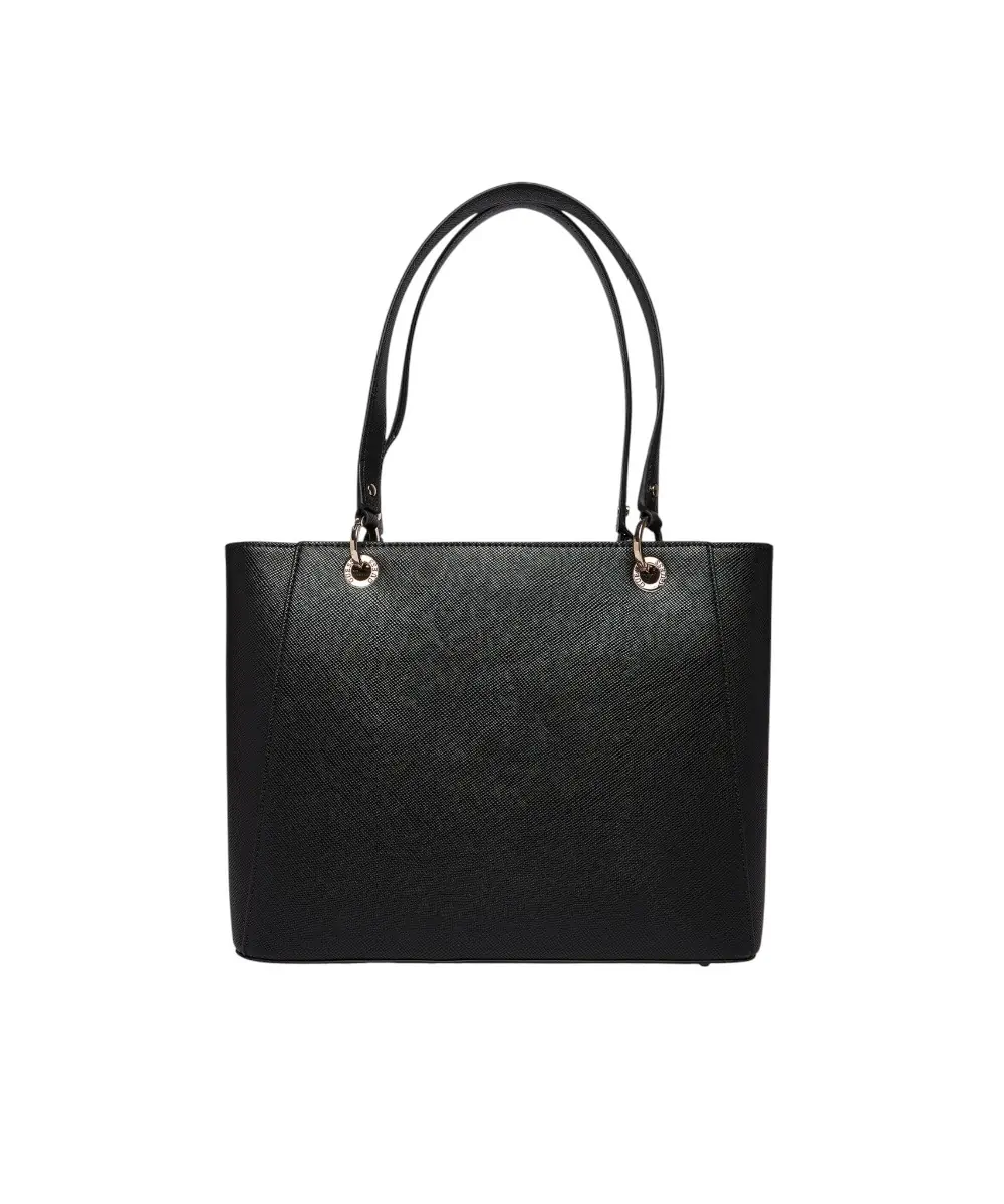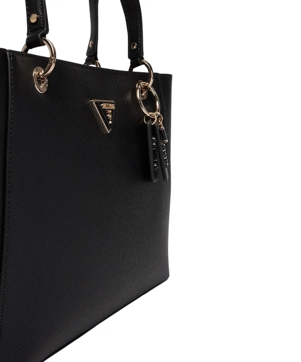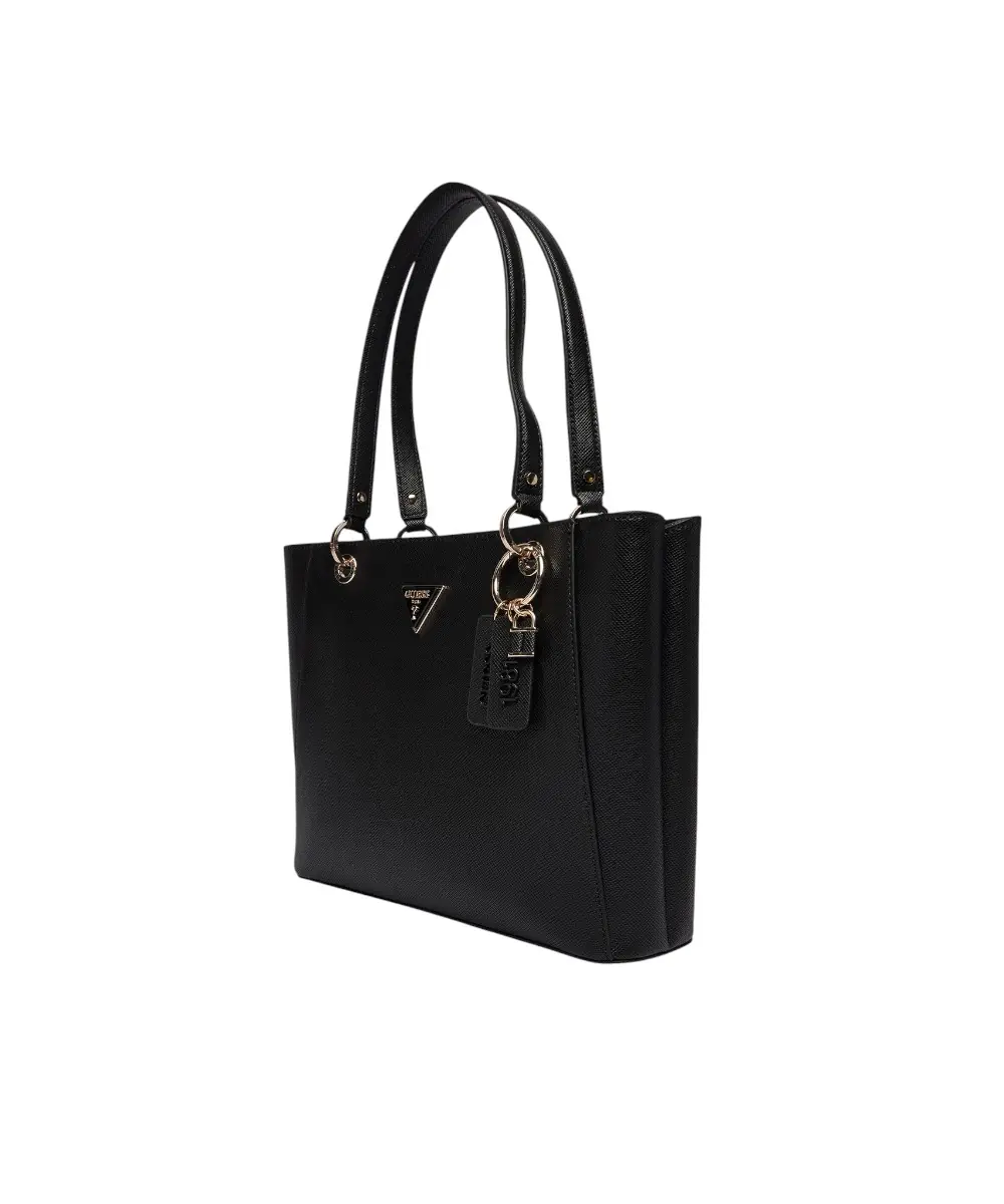 Διαθέτει κεντρικό κλείσιμο με φερμουάρ, διπλή λαβή μήκους 45 cm για μεταφορά στον ώμο ή στο χέρι, και αφαιρούμενο charm λογότυπο στη βάση της λαβής. Η τσάντα περιλαμβάνει έναν ευρύχωρο κύριο χώρο, μία εσωτερική θήκη με φερμουάρ, και μία επίπεδη θήκη, ενώ το τριγωνικό λογότυπο Guess μπροστά προσθέτει premium αισθητική.