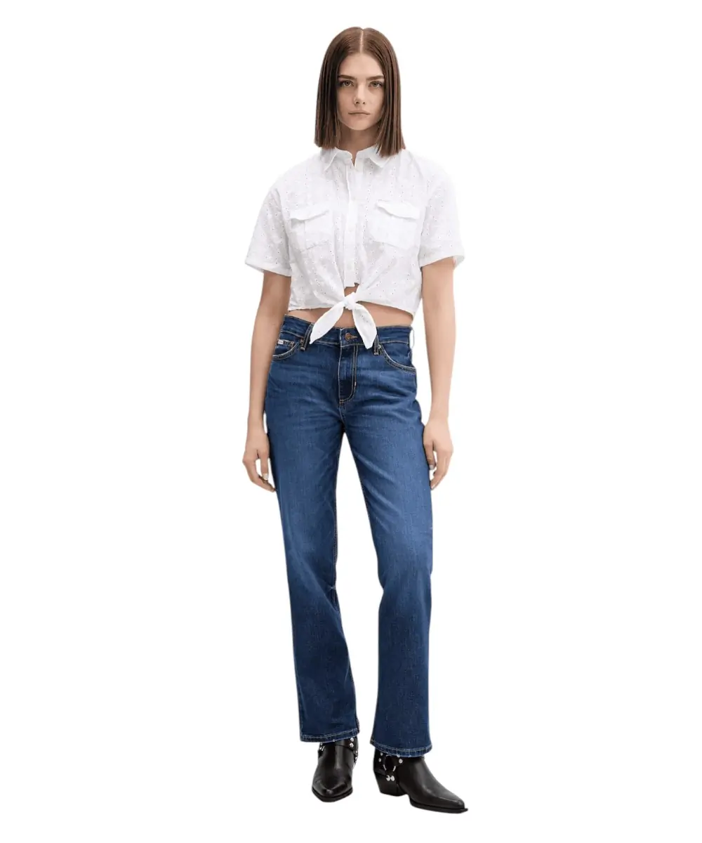 Elegant Straight Look: Η μπλε σκούρο απόχρωση και η ψηλή μέση αναδεικνύονται μοναδικά με ένα μεσάτο πουκάμισο ή ένα εφαρμοστό top σε λευκό ή γαλάζιο χρώμα. Η ίσια γραμμή εξασφαλίζει μια αρμονική ροή από τους γοφούς έως το τελείωμα, καθιστώντας το ιδανικό για να φορεθεί τόσο με sneakers όσο και με loafers.