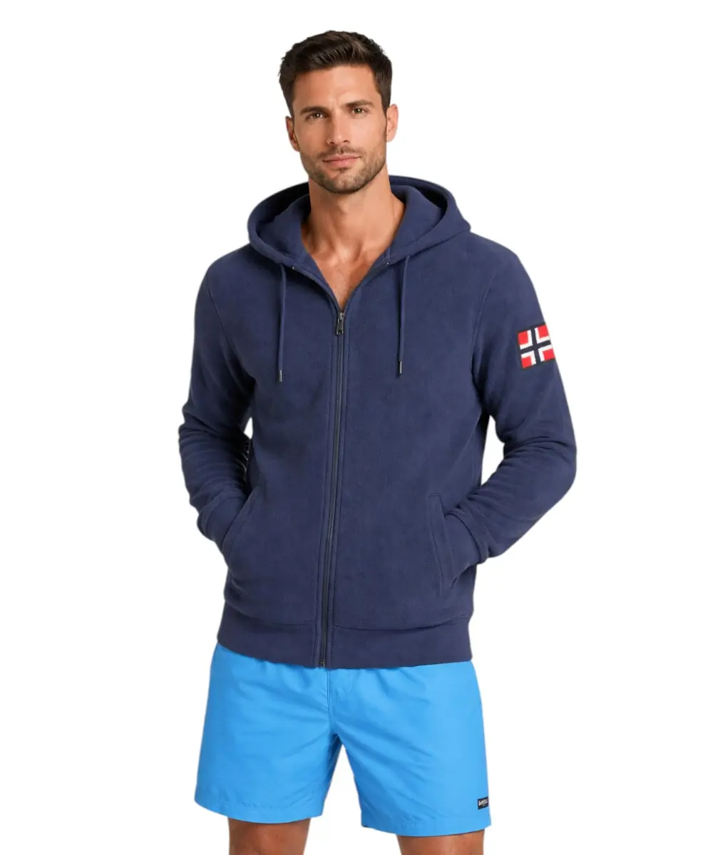 Αυτή η ανδρική ζακέτα με κουκούλα από τη συλλογή Norway 1963 – Scuola Nautica Italiana, σε κλασικό σκούρο μπλε χρώμα (“Navy”), είναι η ιδανική επιλογή για προστασία από το κρύο με ναυτικό στυλ. Κατασκευασμένη από ζεστό υλικό fleece, προσφέρει εξαιρετική θερμομόνωση και άνεση στις καθημερινές σας δραστηριότητες.